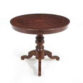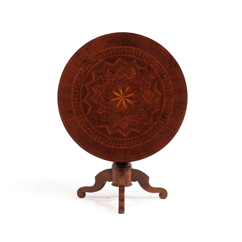 Tavolo tondo con piano a vela intarsiato. XIX secolo