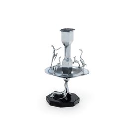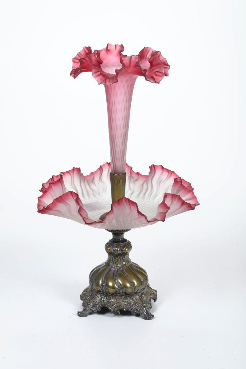 Un centrotavola in ottone cromato con base in marmo nero e un centrotavola in ottone e vetro rosato