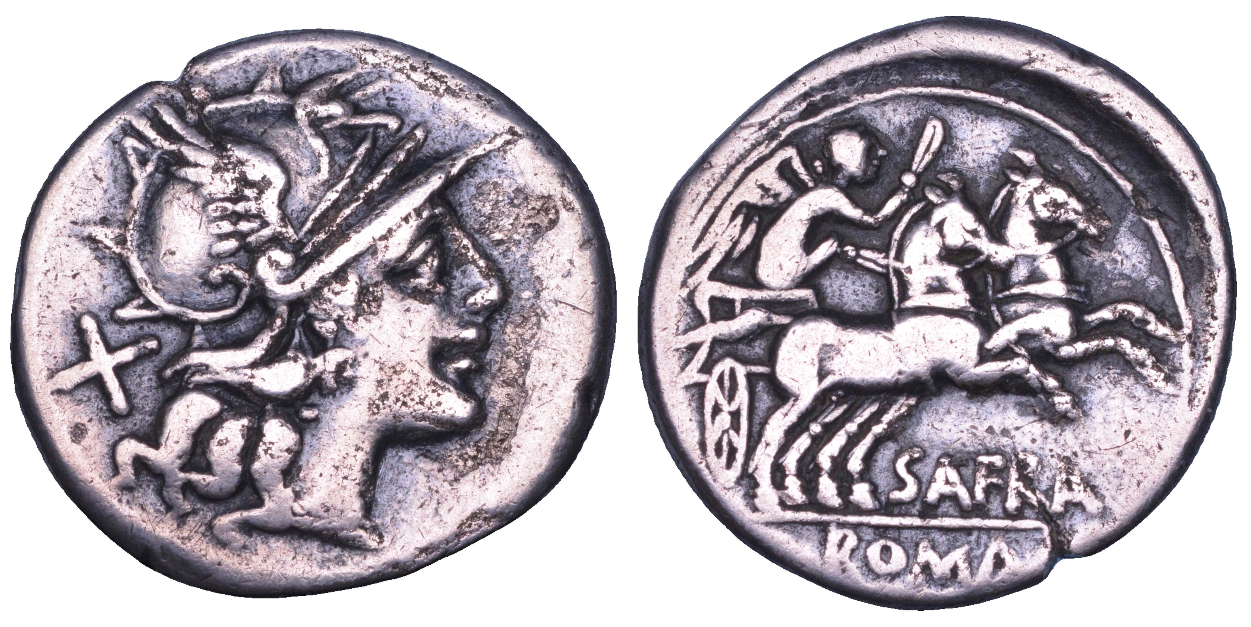 Testa di Roma con elmo a d.; X a s. R/ Vittoria alla guida di una biga a d., con redini e corona; sotto, ROMA su tavoletta. Bab. 1. Cr. 206/1. Syd. 388. g. 3,60. Diam. mm. 18,21. Arg. MB/BB