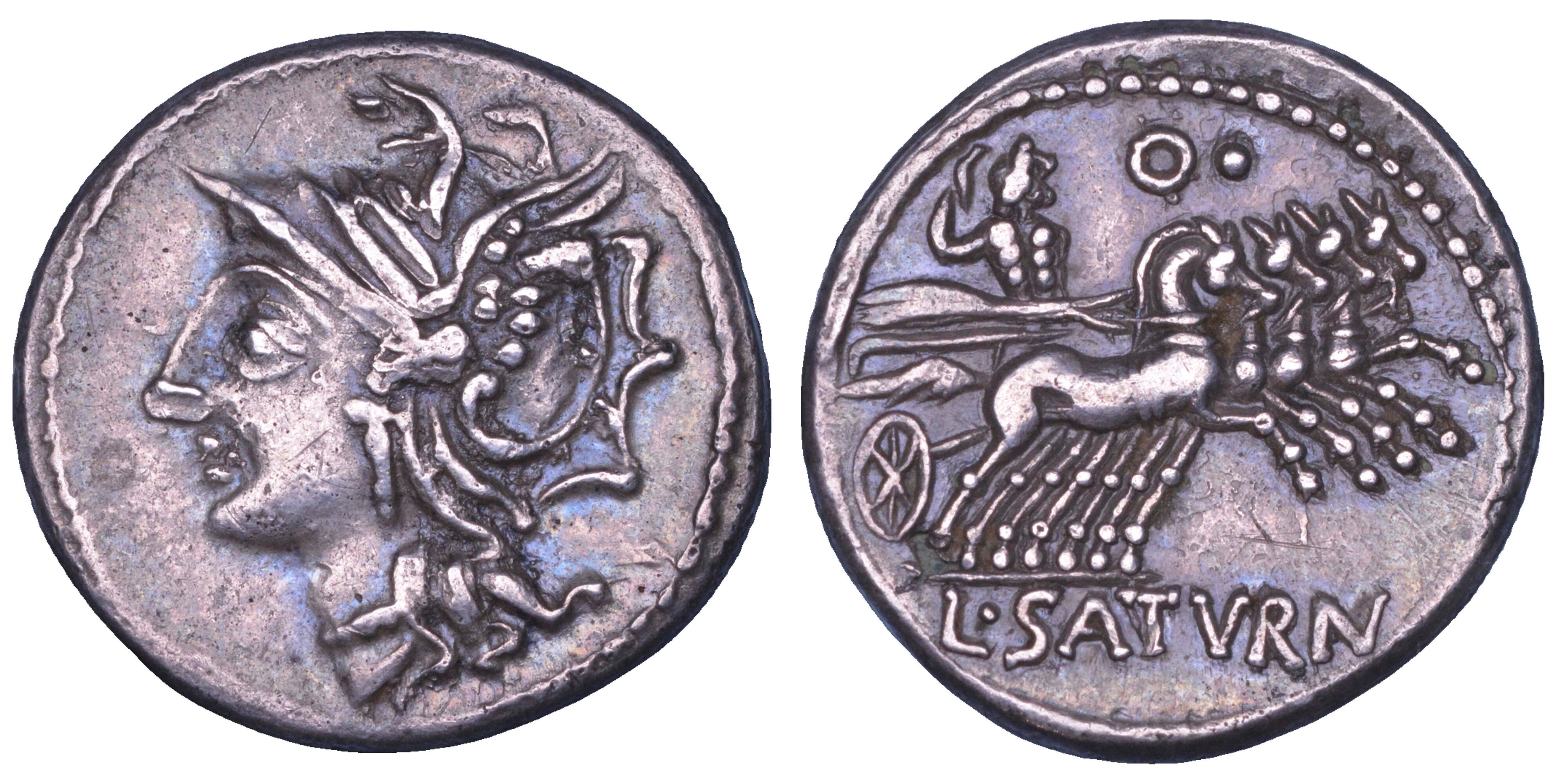 Testa di Roma a sinistra, con elmo alato. R/ Saturno alla guida di una quadriga a d., con le redini nella mano s. e l'arpa nella d.. Bab. 1. Cr. 317/3b. Syd. 578a. g. 2,98. Diam. mm. 18,97. Arg. BB