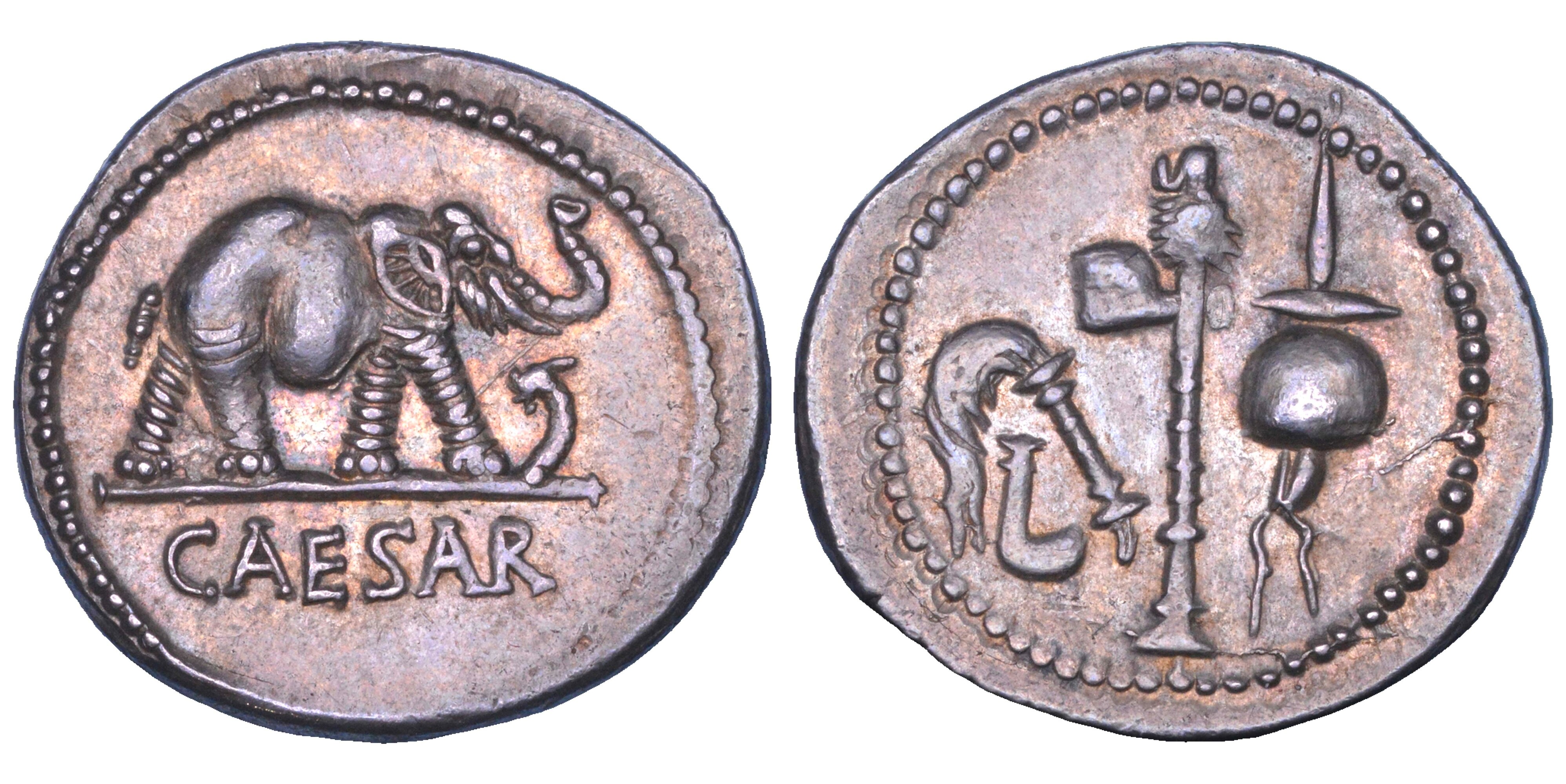 Denario, anni 49-48 a.C. Zecca in movimento con Cesare.