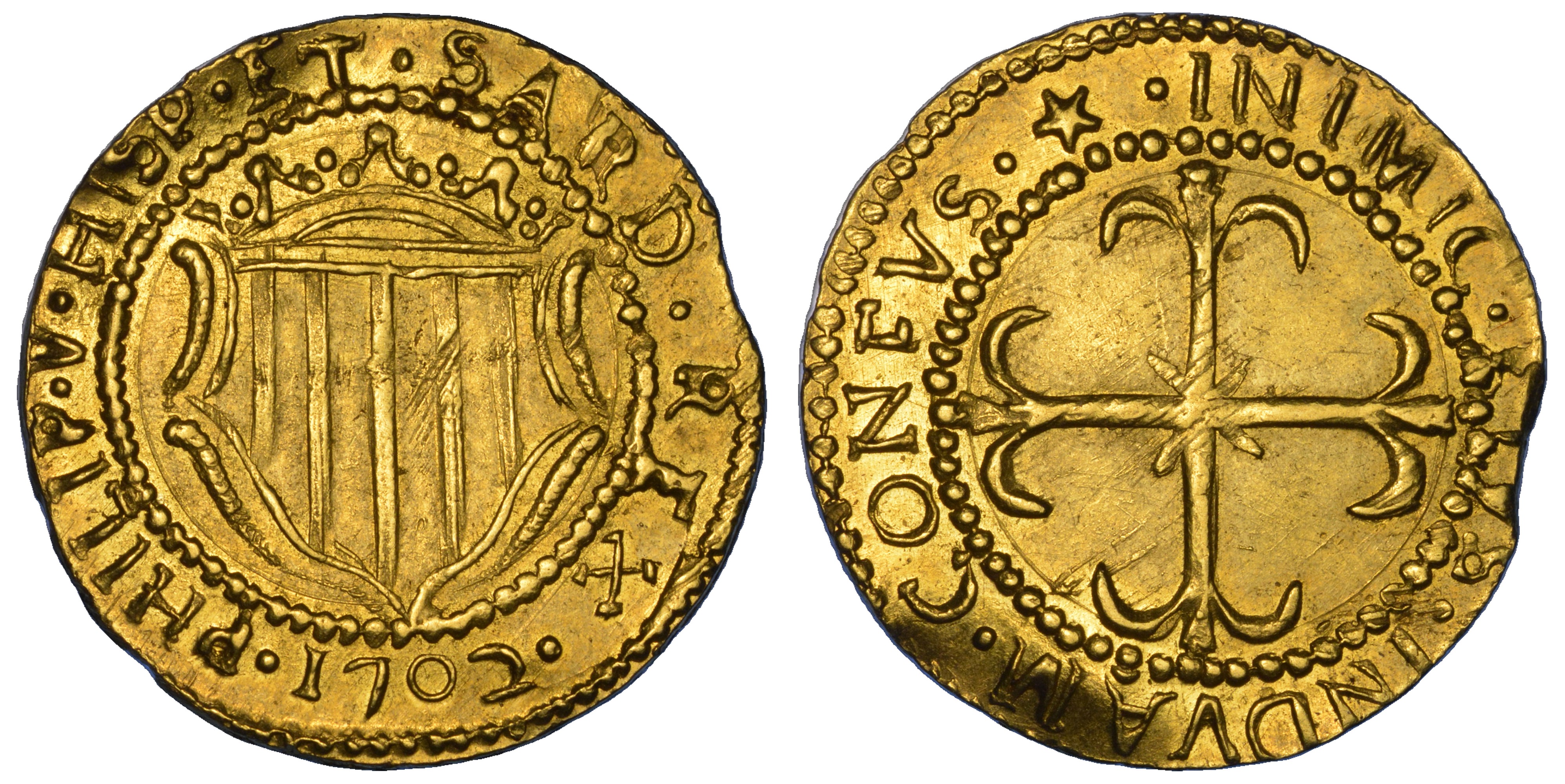 PHILIP V HISP ET SARD REX Stemma coronato; sotto, nel giro, 1702. R/ (Stella) INIMIC EIVS INDVAM CONFVS Croce ancorata. Sollai 5. Alagna 120. CNI 4. MIR 93/2. g. 3,21. Diam. mm. 21,9. Oro. Lieve mancanza di metallo sul bordo SPL