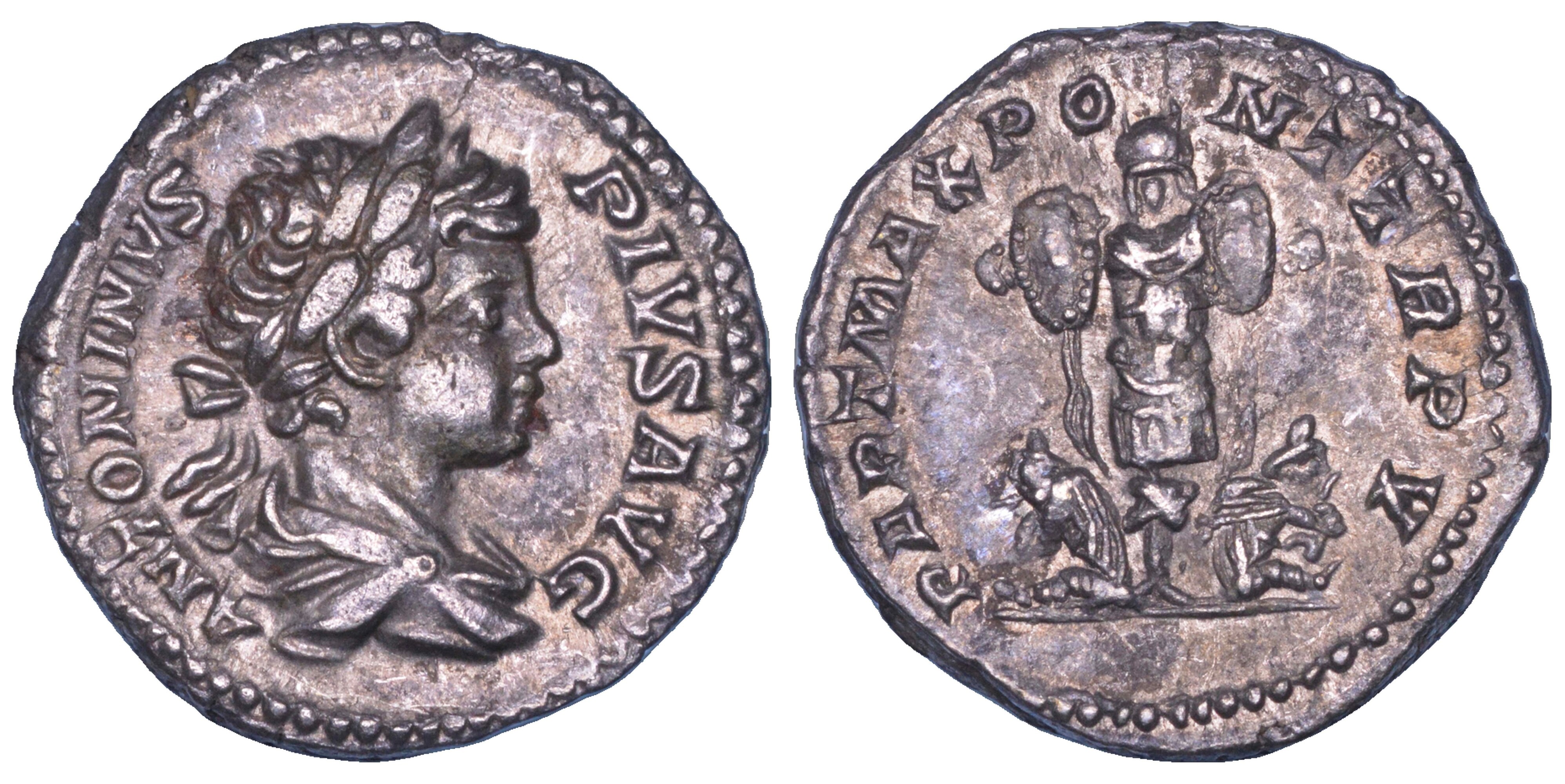 ANTONINVS AVGVSTVS Busto laureato, drappeggiato e corazzato di Caracalla a d.. R/ PART MAX PONT TR P V Trofeo tra due prigionieri seduti in atteggiamento di afflizione. RIC 64. Coh. 179. g. 2,96. Diam. mm. 18,16. Arg. q.SPL
