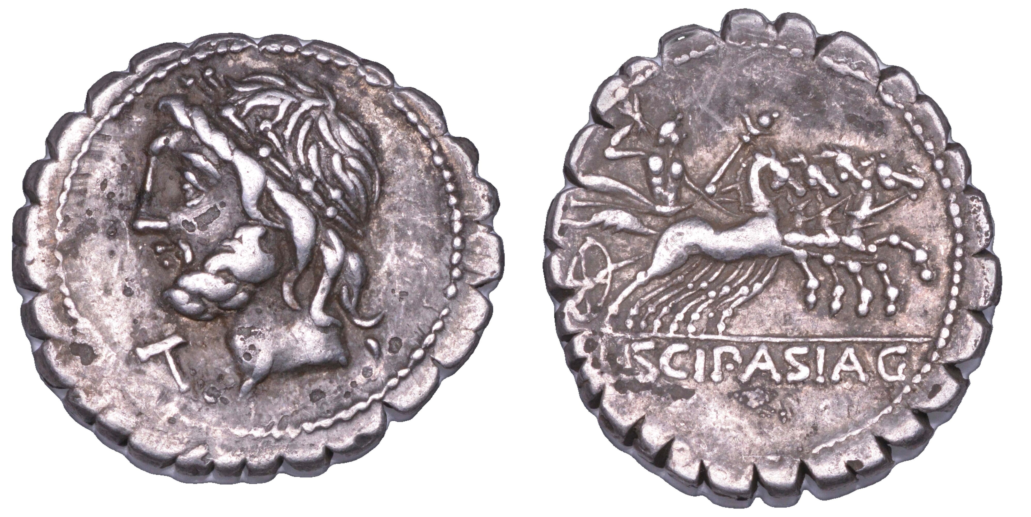 CORNELIA. L. CORNELIUS SCIPIUS ASIATICUS, 106 a. C. Denario serrato.