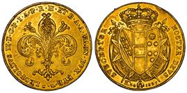 Giglio di Firenze con due fiori. R/ Scudo coronato. Gig. 1. Mont. n. 305. Raro. g. 32,55. Diam. mm. 31,35. Oro. Colpetti. q.SPL