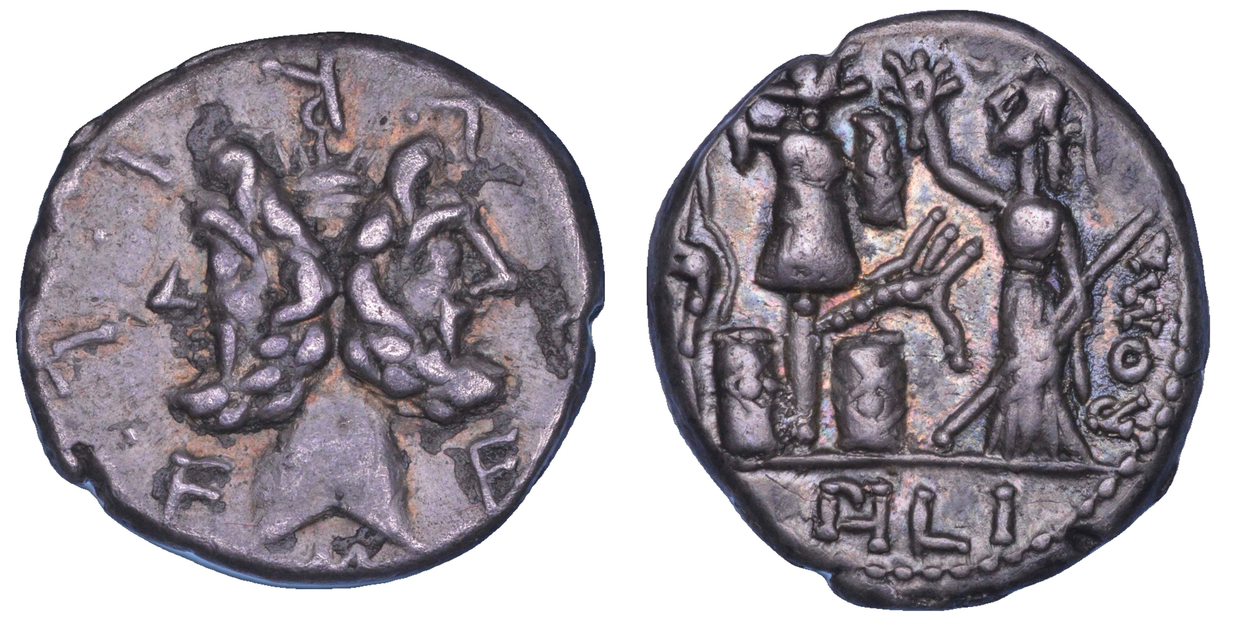 Testa laureata di Giano. R/ Roma in piedi verso s., indossa un elmo corinzio e tiene in mano uno scettro; a s., un trofeo fiancheggiato da un carnyx e uno scudo su ciascun lato. Bab. Furia 18. Syd. 529. Cr. 281/1. g. 3,88. Diam. mm. 17,24. Arg. Di bello stile. BB/q.SPL