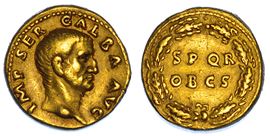 IMP SER GALBA AVG Testa nuda a destra. R/ SPQR OB C S in due righe entro corona di quercia. RIC 164. Calico 509. Raro. g. 7,23. Diam. mm. 17,64. Oro. Bel ritratto. BB