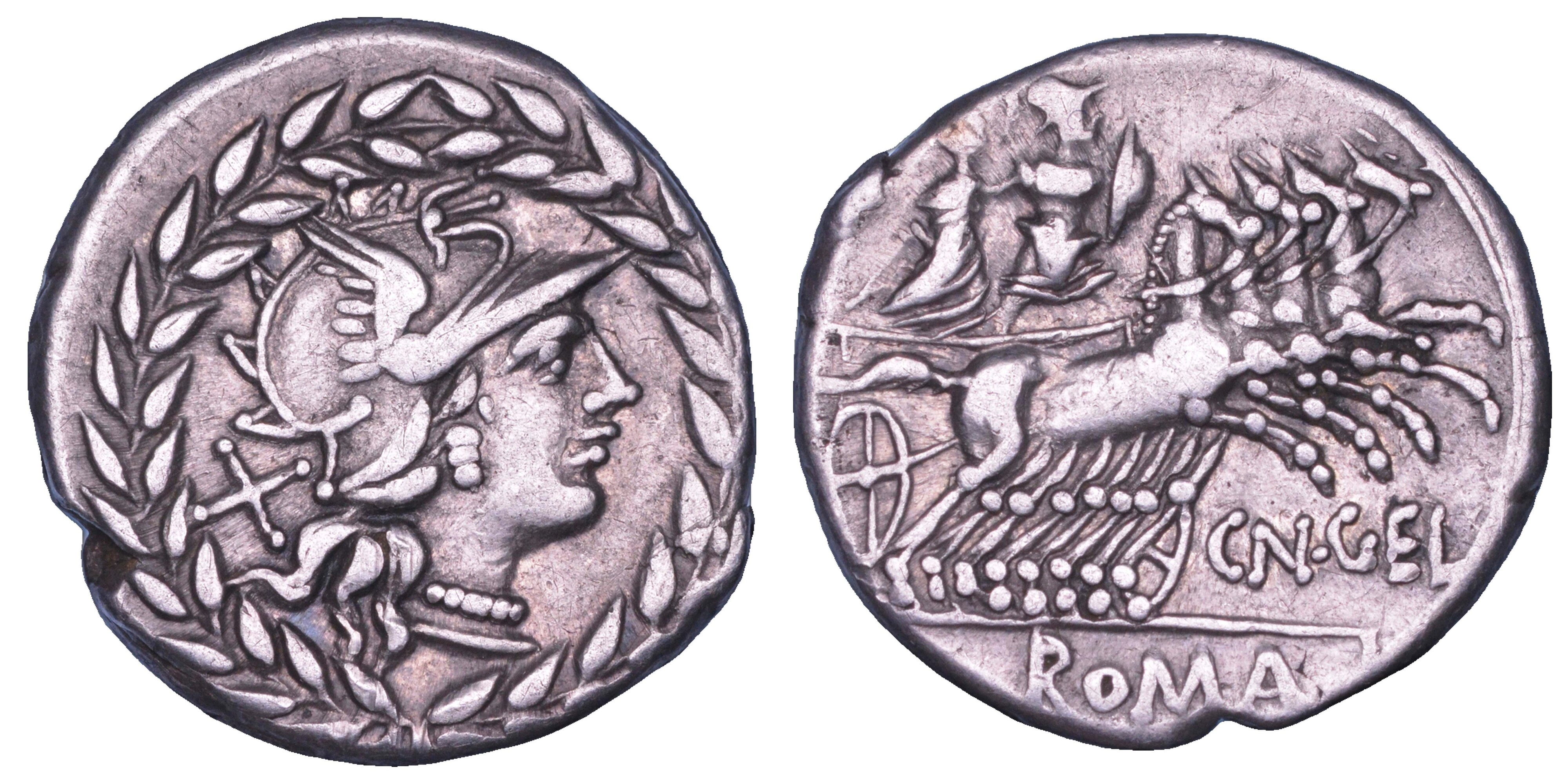 GELLIA. Cn. Gellius, 138 a.C. Denario.