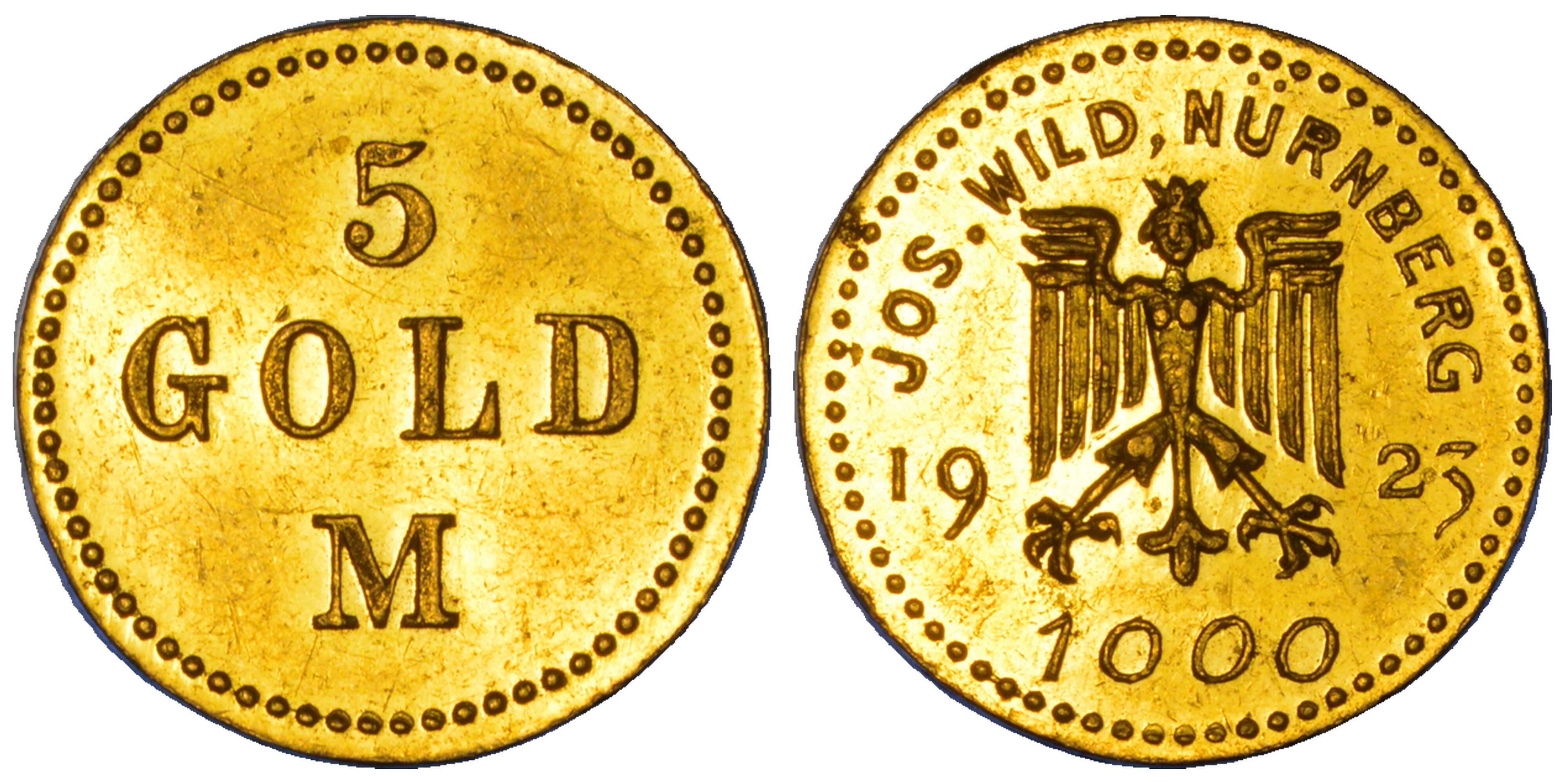 GERMANIA - NORIMBERGA. MONETE DELL'ORAFO DI NORIMBERGA JOSEF WILD. 5 Marchi d'Oro (1/2 ducato d'Oro) 1923.