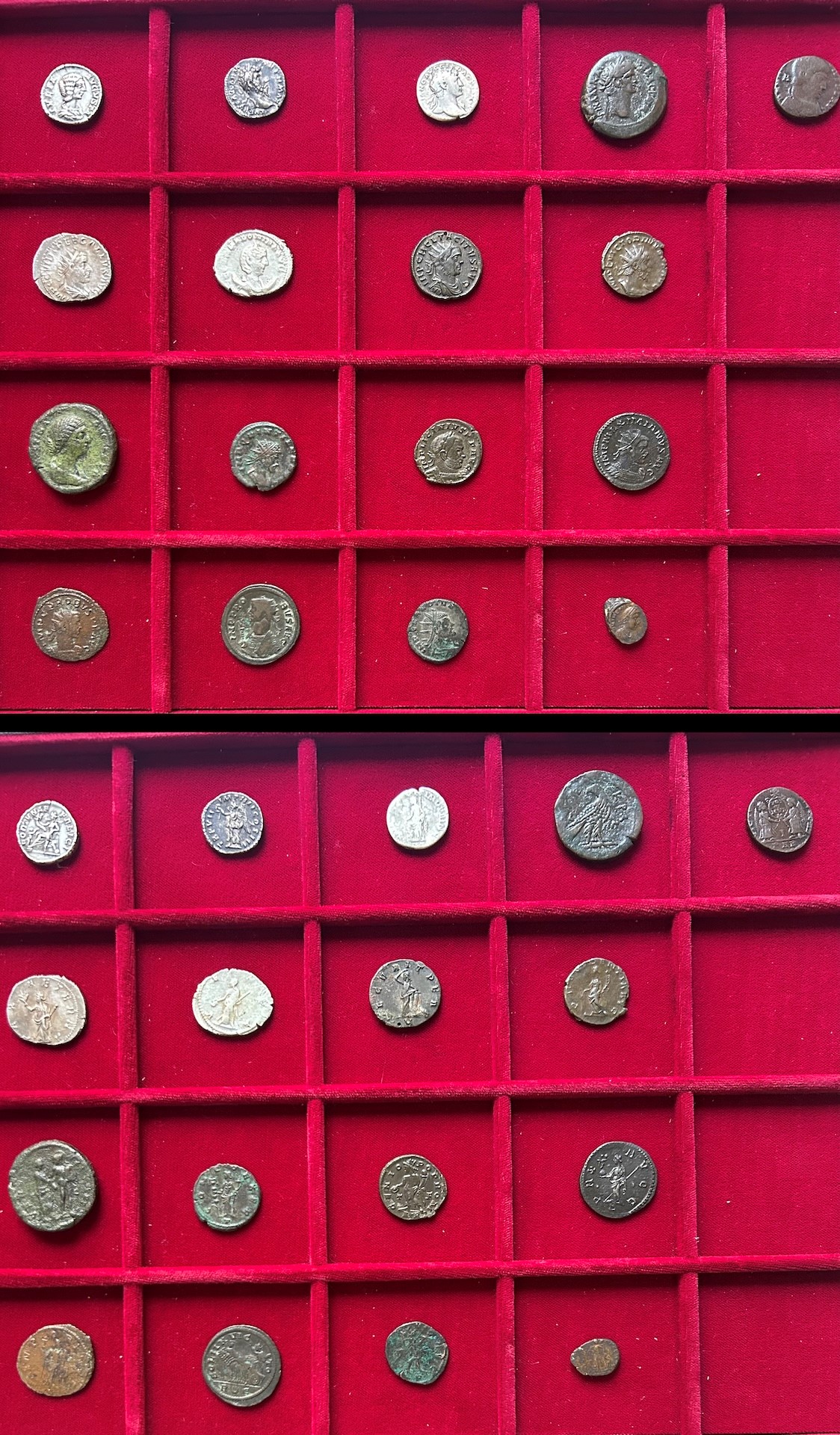 Monetazione mista coniata dal I a IV secolo. Si segnalano esemplari di molteplici imperatori e auguste fra i quali Claudio, Traiano, Faustina II, Lucio Vero, Giulia Domna, Salonina, Treboniano Gallo, Claudio II, Probo, Vittorino, Tacito, Licinio . Presenti alcuni denari e antoniniani. Argento e bronzo. Conservazioni varie.