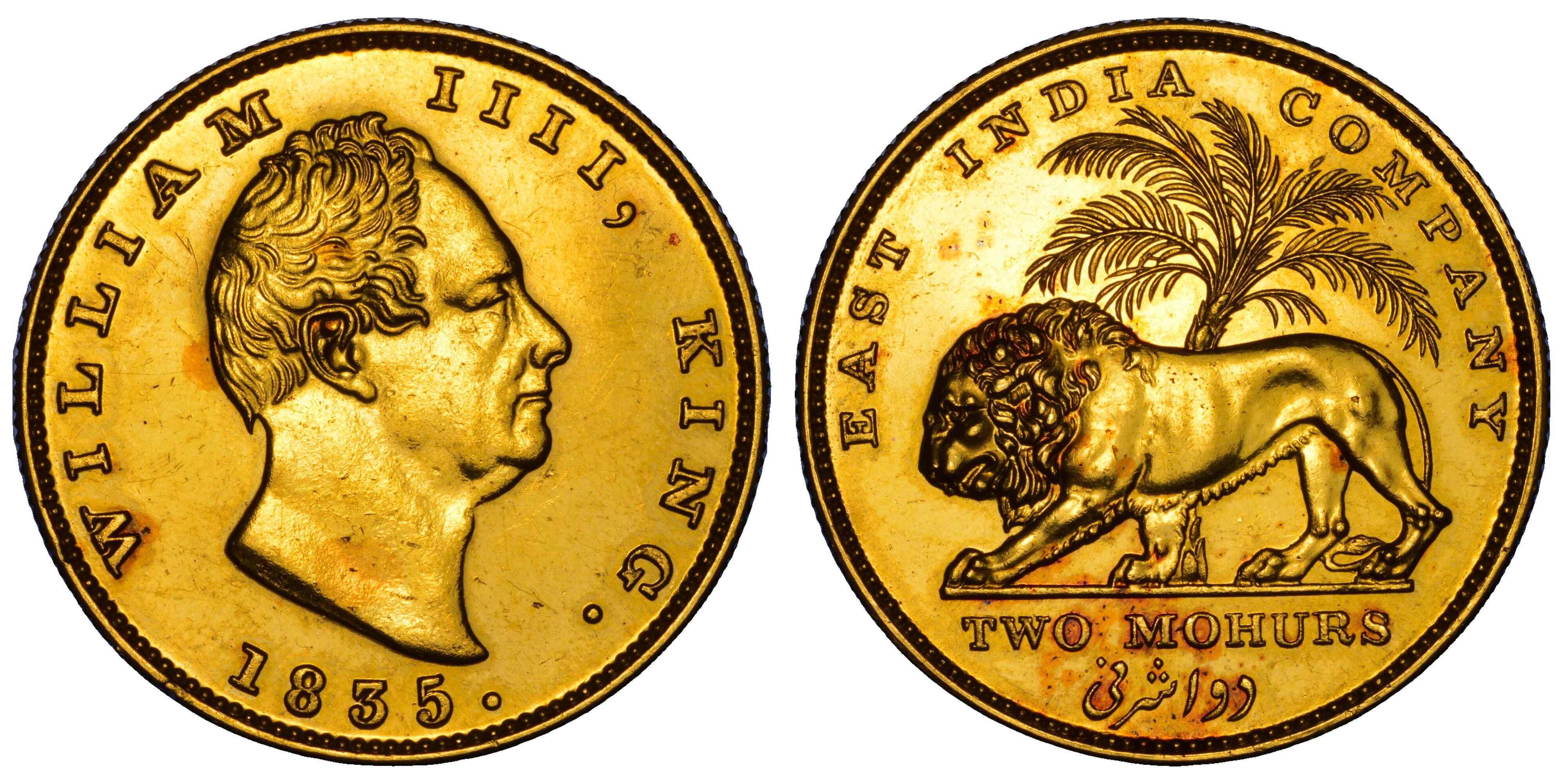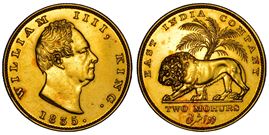 Testa a d. di Guglielmo IIII. R/ Leone che avanza a s.; palma dietro; in esergo, DUE MOHURS . Bordo zigrinato. UCI 1.4; Pridmore 3; Friedberg 1592b Rarissimo g. 23,20. Diam. mm. 32,65 Oro Lievi graffi q.SPL