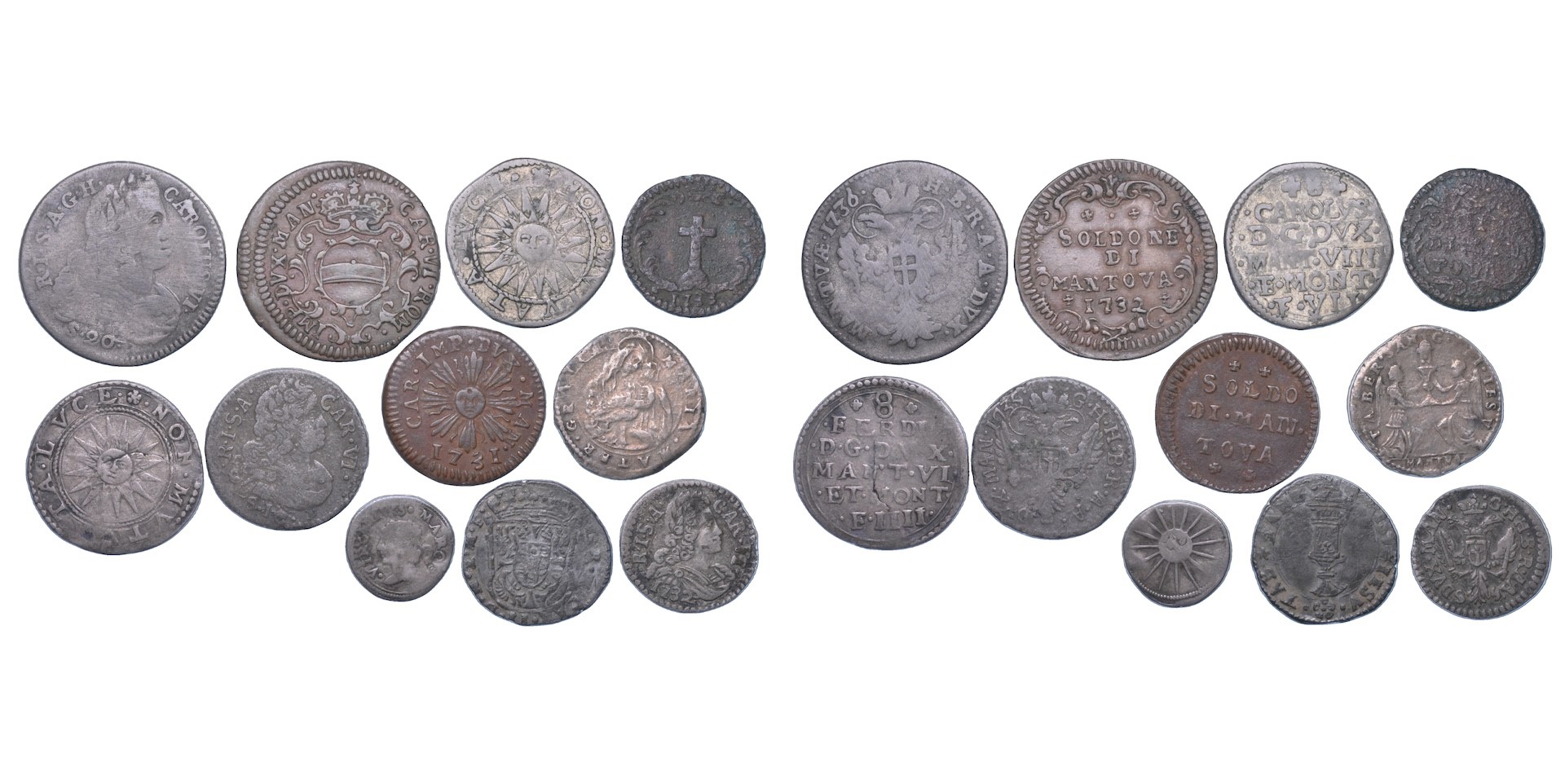 Monetazione mista coniata sotto i duchi Ferdinando, Maria Gonzaga (reggente), Carlo II e Carlo VI. Esemplari in argento e rame. conservazioni da B a BB.