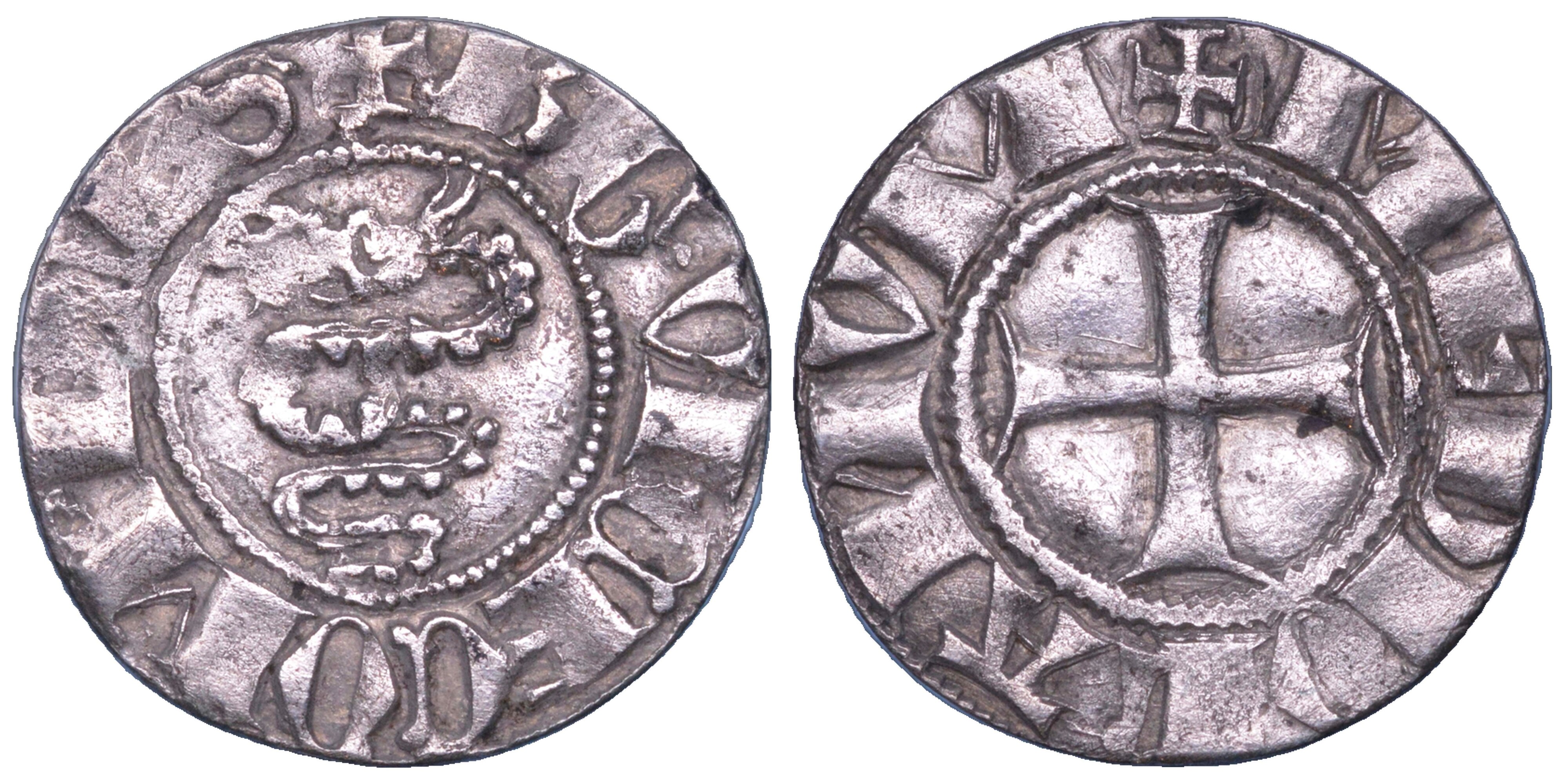 + B G VICECOMITES Nel campo, biscia. R/ + MEDIOLANVM Croce. Crippa 5/A. MIR 105/a. g. 0,92. Diam. mm. 16,78. Arg. BB
