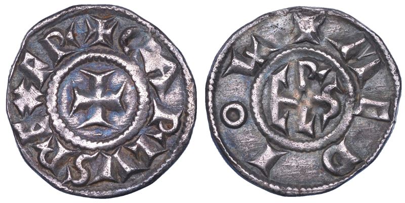 CARLVS REX Intorno a croce. R/ MEDIOL intorno a monogramma di CAROLVS. Crippa 4/A. MEC, 743. MIR 4/1. CNI 24. Molto raro. g. 1,65. Diam. mm. 20,67. Arg. BB