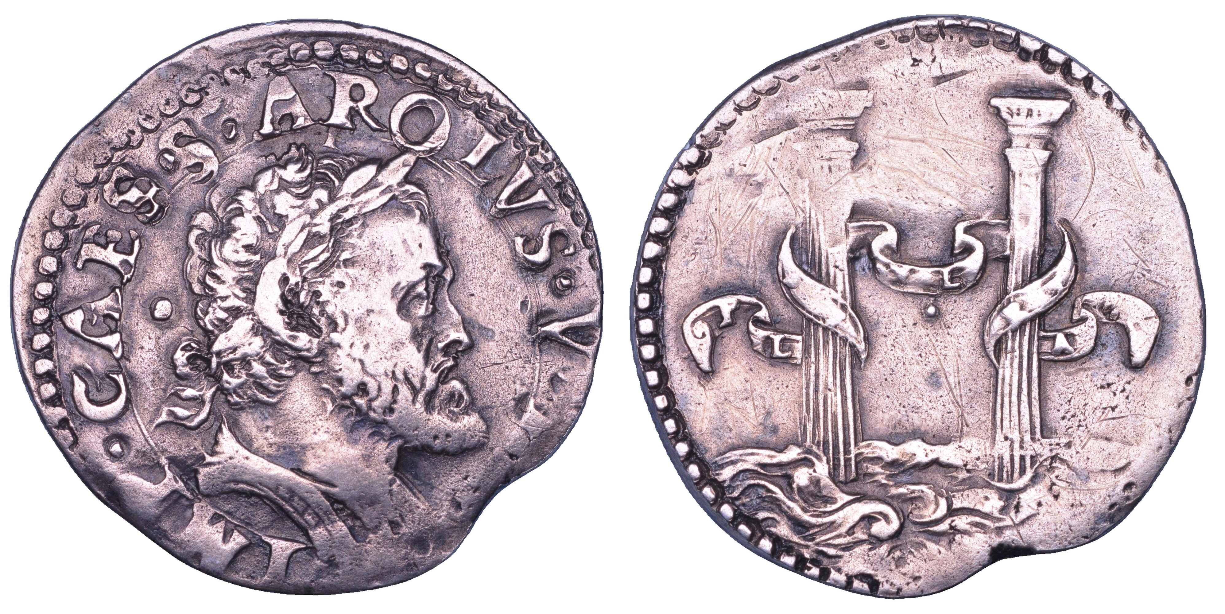 IMP CAES CAROLVS V AVG Busto a d. laureato ed in corazza all'antica. R/ Le colonne d'Ercole avvolte da fascia con motto PLVS VLTRA (poco visibile). Crippa 11/A. MIR 284/2. g. 8,75. Diam. mm. 27,62. Arg. Saggio a ore 12. Bordo limato. MB/BB