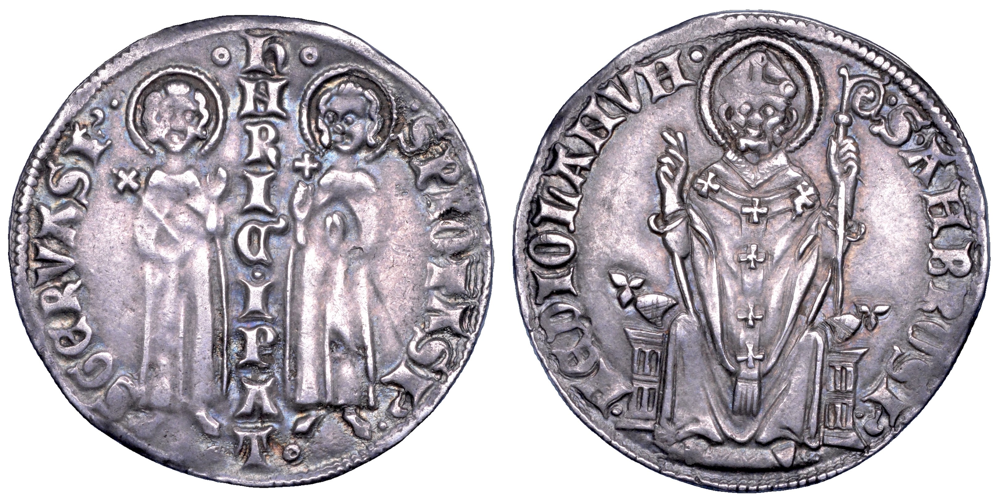 hENRIC IPAT scritto al centro verticalmente. Nel giro, S PROTASI a d., S GERVASI a s. I santi Protasio e Gervasio nimbati, stanti di fronte, stringono ciascuno una piccola croce nella mano d. R/ S AMBROSI’ MEDIOLANVM Il Santo nimbato e mitrato, seduto di fronte, benedice con la d. e stringe il pastorale nella s. Crippa 5. MEC, 590. CNI 1 var. MIR 76/1. Molto raro. g. 4,17. Diam. mm. 26,00. Arg. buon BB