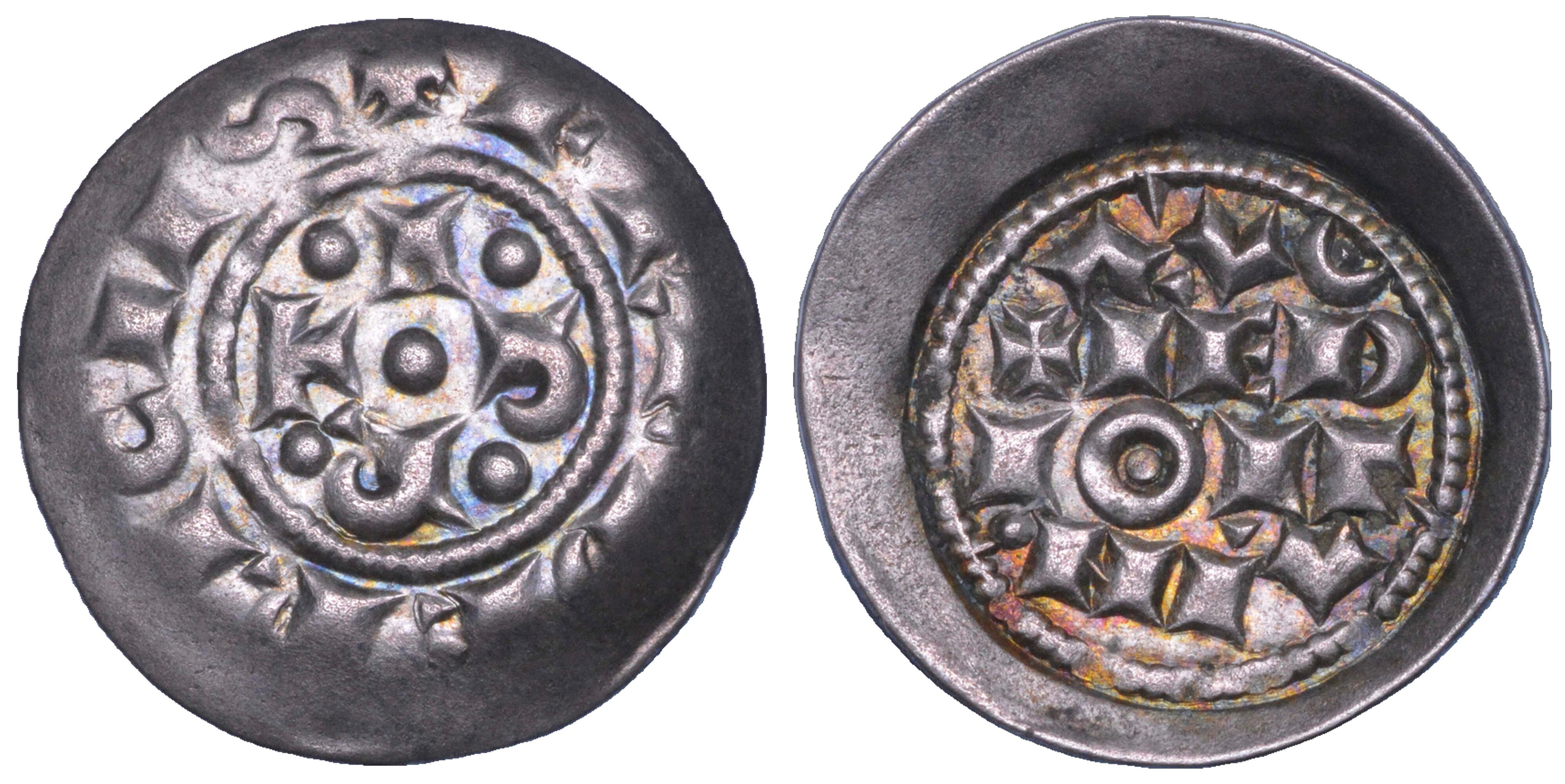 Coniazioni di emergenza a Nosedo, anni 1162-1167. I • P • R• T • (ImPeRaTor) intorno a globetto centrale; intorno + FREDERICVS (lettera S coricata). R/ ΛVG +[ME]D IOLΛ NIV. Crippa, 14/B. CNI 6/11. Murari 17. MEC, 72. MIR 50/5. Varietà con tre cunei al rovescio di cui uno terminante con un globetto. Molto rara. g. 0,88. Diam. mm. 16,96. Arg. SPL Bellissimo esemplare, patina lievemente iridescente di monetiere.