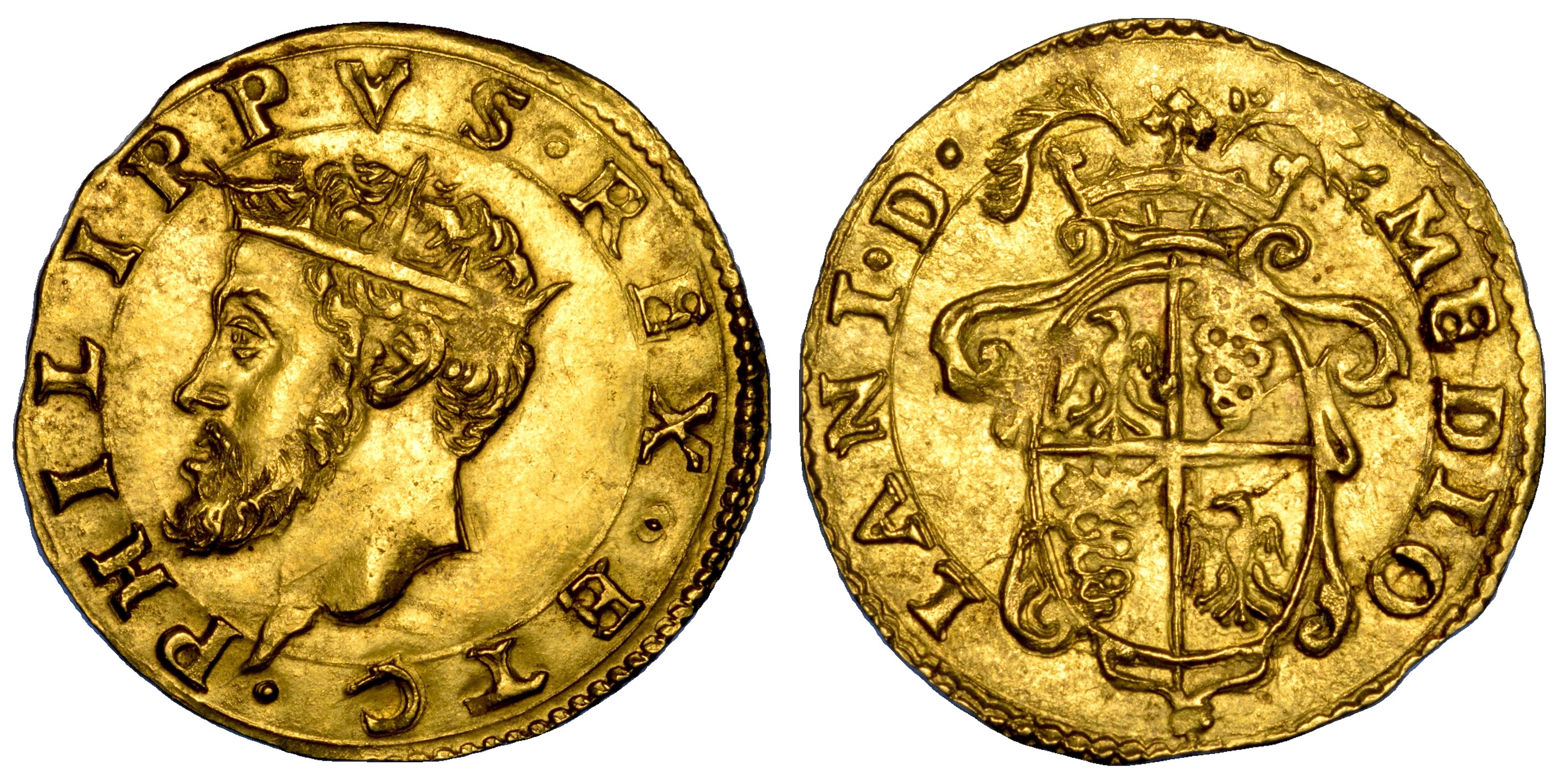 PHILIPPVS REX ETC Testa a s. con corona radiata. R/ MEDIO LANI D Stemma ovale, inquartato con l'aquila coronata e la biscia non coronata. Sopra, corona da cui escono rami di palma e di olivo. Crippa 8. MIR 305/1. Molto raro. g. 3,30. Diam. mm. 23,12. Oro. q.FDC/SPL
