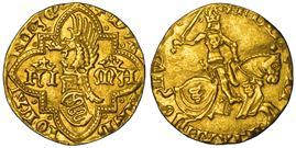 + DVX MED IOLA NI 3 C Scudetto con la biscia viscontea, sormontato da elmo con cimiero ornato da drago piumato con fanciullo nelle fauci. Ai lati, le lettere FI – MA sormontate da corona ducale; intorno, cornice con piccoli anelli negli angoli. R/ + FILIPVM ARIA A N GLV Il duca in armatura a cavallo al galoppo a d. Sulla corazza e sulla gualdrappa, piccole bisce. Sopra la testa del cavallo, piccola stella. Crippa 1/C. CNI 1/16. MEC 1, tipo 672. MIR 150/1a. g. 3,36. Diam. mm. 20,68. Oro. BB