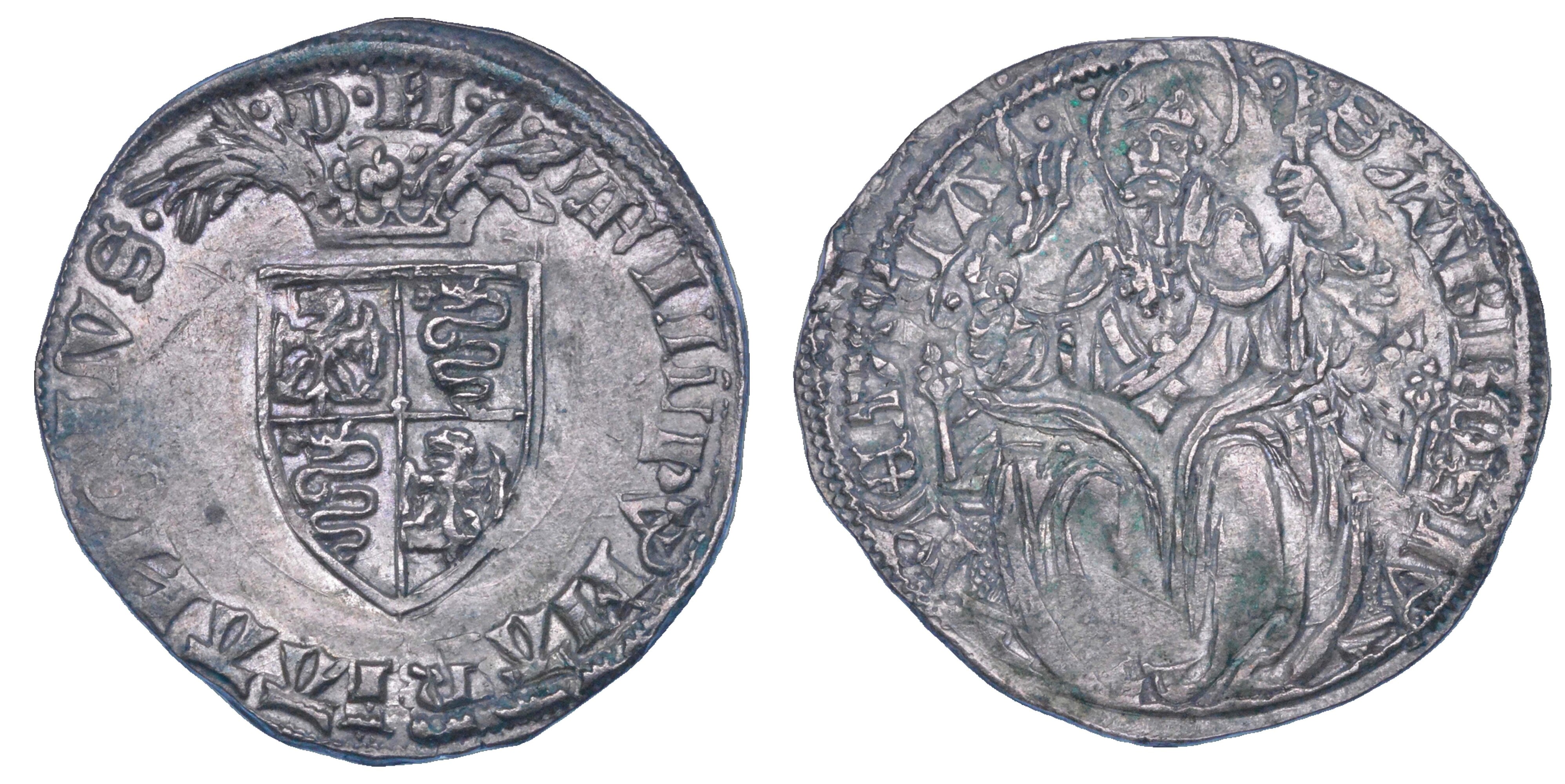 FILIPV MARIA ANGLVS DM Stemma di Milano sormontato da corona da cui escono rami di palma e di olivo. R/ S AMBROSIVS MEDIOLANI Sant’Ambrogio, mitrato e nimbato, seduto di prospetto in cattedra, tiene nelle mani staffile e pastorale; sul petto del santo, un piccolo sole raggiante. Crippa 4. g. 2,29. Diam. mm. 23,97. Arg. q.SPL