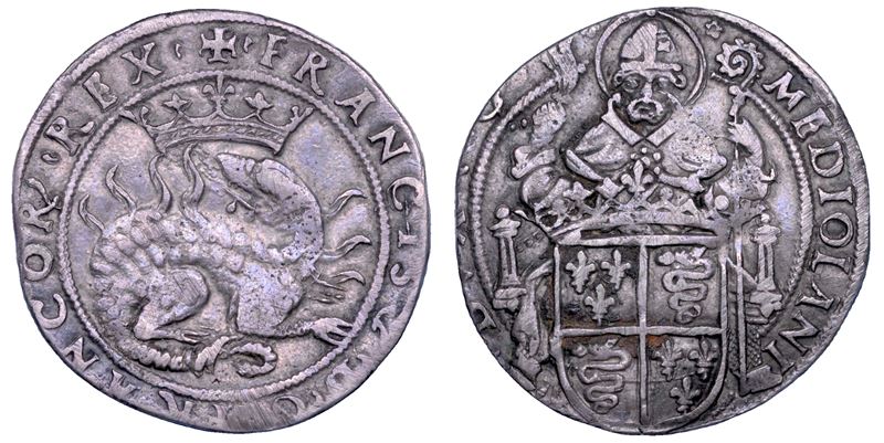 FRANCISC' D G FRANCOR' REX Salamandra tra le fiamme; in alto, corona. R/ MEDIOLANI DVX 7 C' Sant’Ambrogio, seduto in trono di fronte, tiene con la d. lo staffile e con la s. il pastorale; davanti, in primo piano, stemma quadripartito con le armi di Francia e Milano. Crippa 4. MIR 262. Molto raro. g. 3,70. Diam. mm. 25,15. Arg. Lieve tosatura. BB