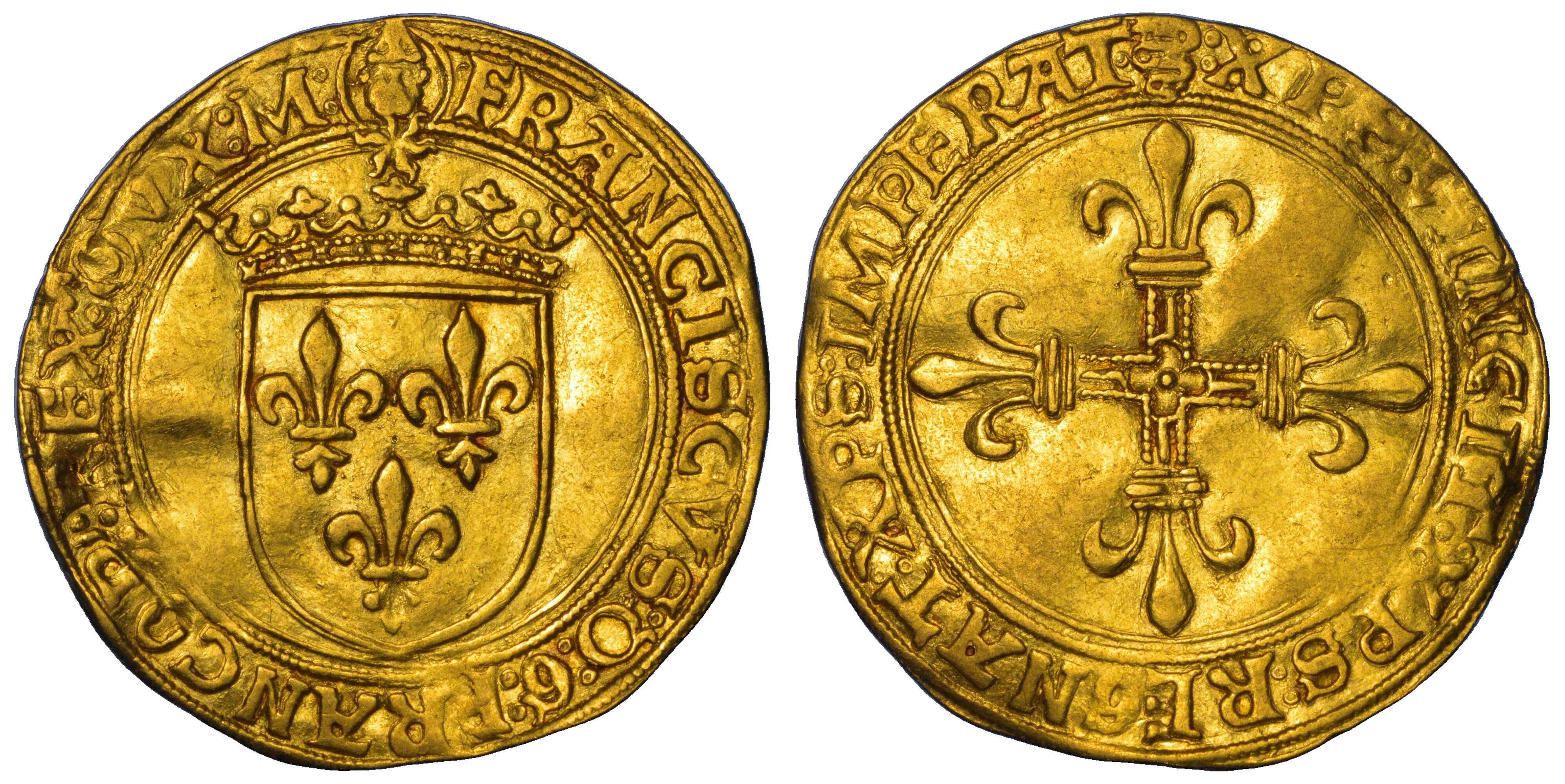 (testina di S. Ambrogio) FRANCISCVS D G FRANCOR REX DVX M Scudo di Francia coronato sopra, piccolo sole raggiante. R/ (biscia) XPS VINCIT XPS REGNAT XPS IMPERAT Croce ornata alle estremità da gigli. Crippa 2. MIR 260/1. Molto raro. g. 3,38. Diam. mm. 26,52. Oro. Lieve ondulazione del tondello. BB