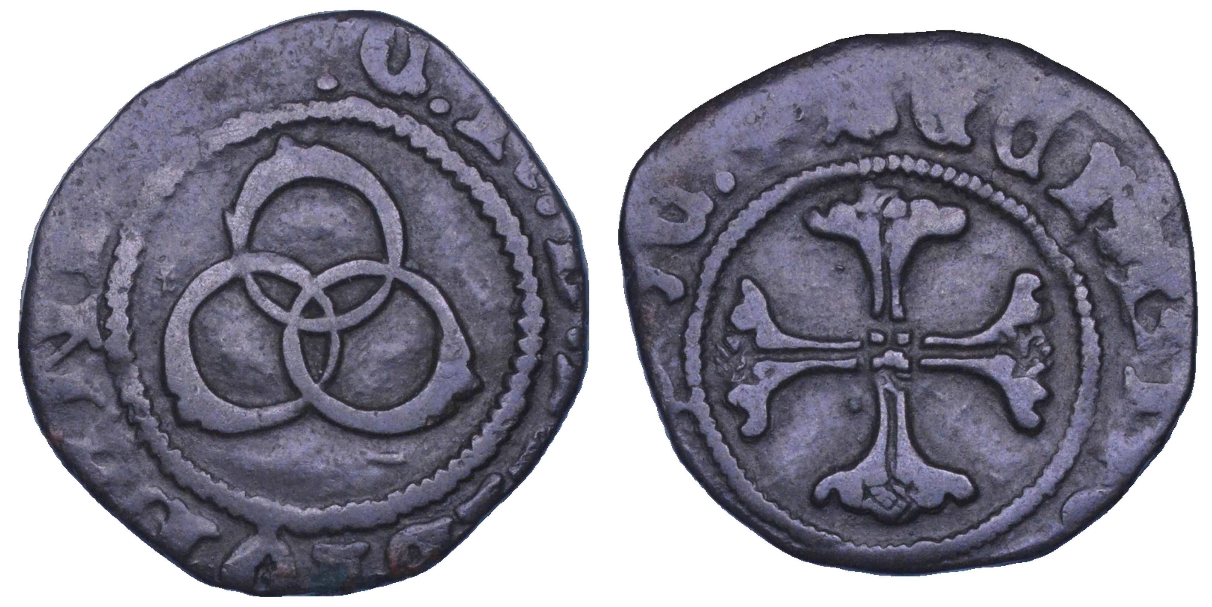 + FR SF DVX MLI 3 C Nel campo, l'impresa dei tre anelli con diamante. R/ + PAPIE ANGLE Q 3 CO Croce gigliata. Crippa, 19. MIR 184/1. Molto raro. g. 1,01. Diam. mm. 11,01. Mist. B/MB