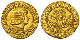 (testina di S. Ambrogio) G3 M SF VICECOS DVX MLI V Busto adulto a d. corazzato e a testa nuda. R/ + PP ANGLE Q3 CO AC IANVE D 3 C Scudetto con la biscia sormontato da elmo coronato e cimiero ornato da drago crestato. Ai lati, i tizzoni con le secchie e le lettere G3 – M. Crippa 5. MEC 1, 732. MIR 200/6. Raro. g. 3,44. Diam. mm. 23,60. Oro. Impercettibile graffio e irregolarità di conio al diritto. SPL