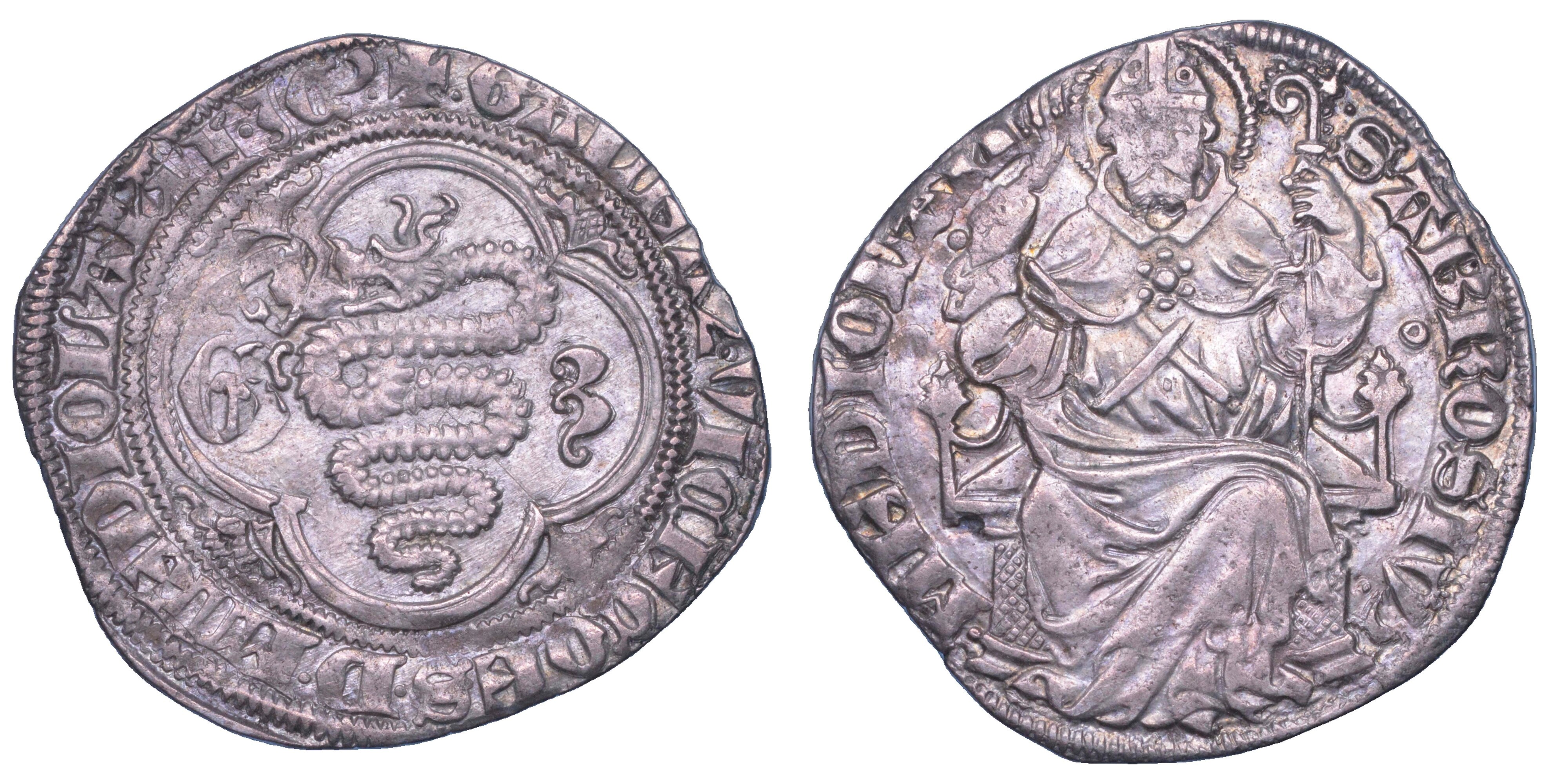 Biscia viscontea affiancata dalle iniziali G – 3, entro cornice ornata da piccoli gigli. Nessun segno sopra la biscia. R/ Sant’Ambrogio, mitrato, nimbato, in cattedra, seduto di prospetto e con staffile e pastorale nelle mani; ai lati, due piccoli anelli. Crippa 4/A. g. 2,38. Diam. mm. 24,05. Arg. BB