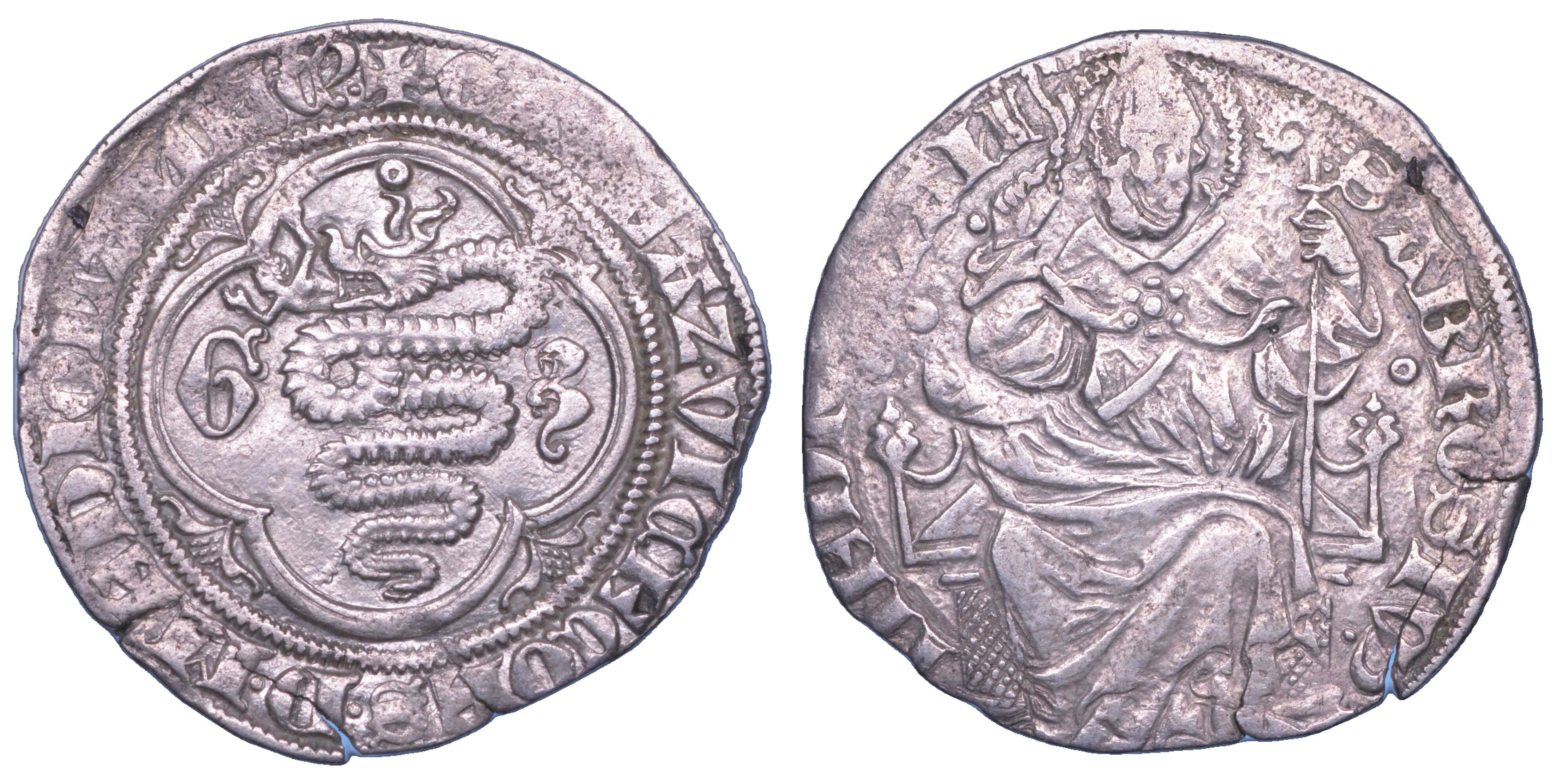 + GALEAZ VICECOES D MEDIOLANI 3 C Biscia viscontea affiancata dalle iniziali G – 3, entro cornice ornata da piccoli gigli. Sopra la biscia, un anello. R/ S AMBROSIV MEDIOLAN Sant’Ambrogio, mitrato, nimbato, in cattedra, seduto di prospetto e con staffile e pastorale nelle mani; ai lati, due piccoli anelli. Crippa 4/C. MEC 634. MIR 121/4. Raro. g. 2,32. Diam. mm. 24,26. Arg. BB/q.SPL Ex Listino Crippa Numismatica Primavera 2005, lotto n. 370.