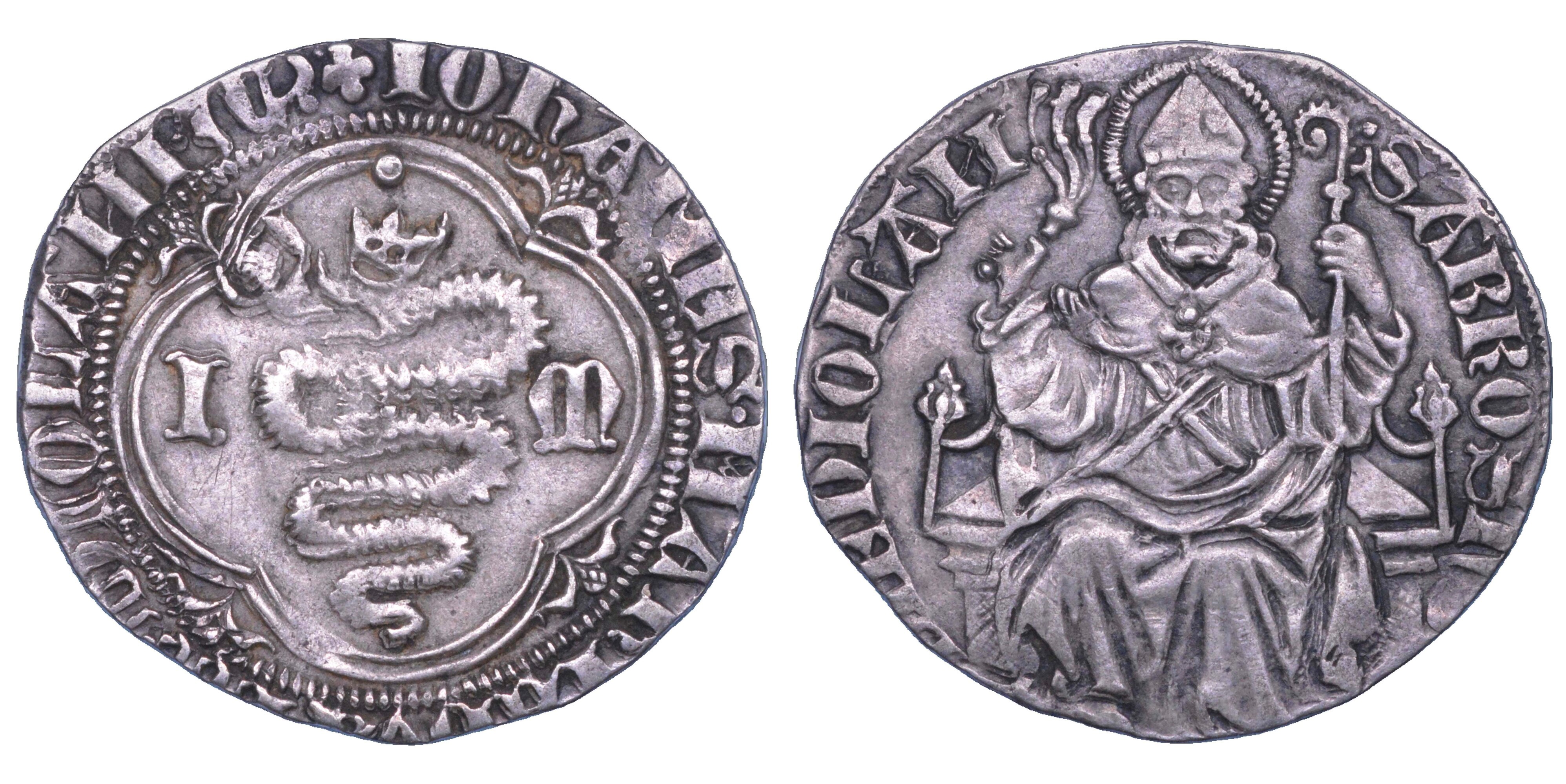 + IOHANES MARIA DVX MEDIOLANI 3 C Biscia viscontea coronata, entro cornice ornata di fiori; ai lati le iniziali I – M. Sopra la testa della biscia, anello. R/ S ABROSIV MEDIOLAN Sant’Ambrogio, mitrato e nimbato, seduto di prospetto in cattedra, con staffile e pastorale nelle mani; nessun globetto ai lati del Santo. Crippa 2/A. MIR 135/1. g. 2,38. Diam. mm. 22,48. Arg. BB