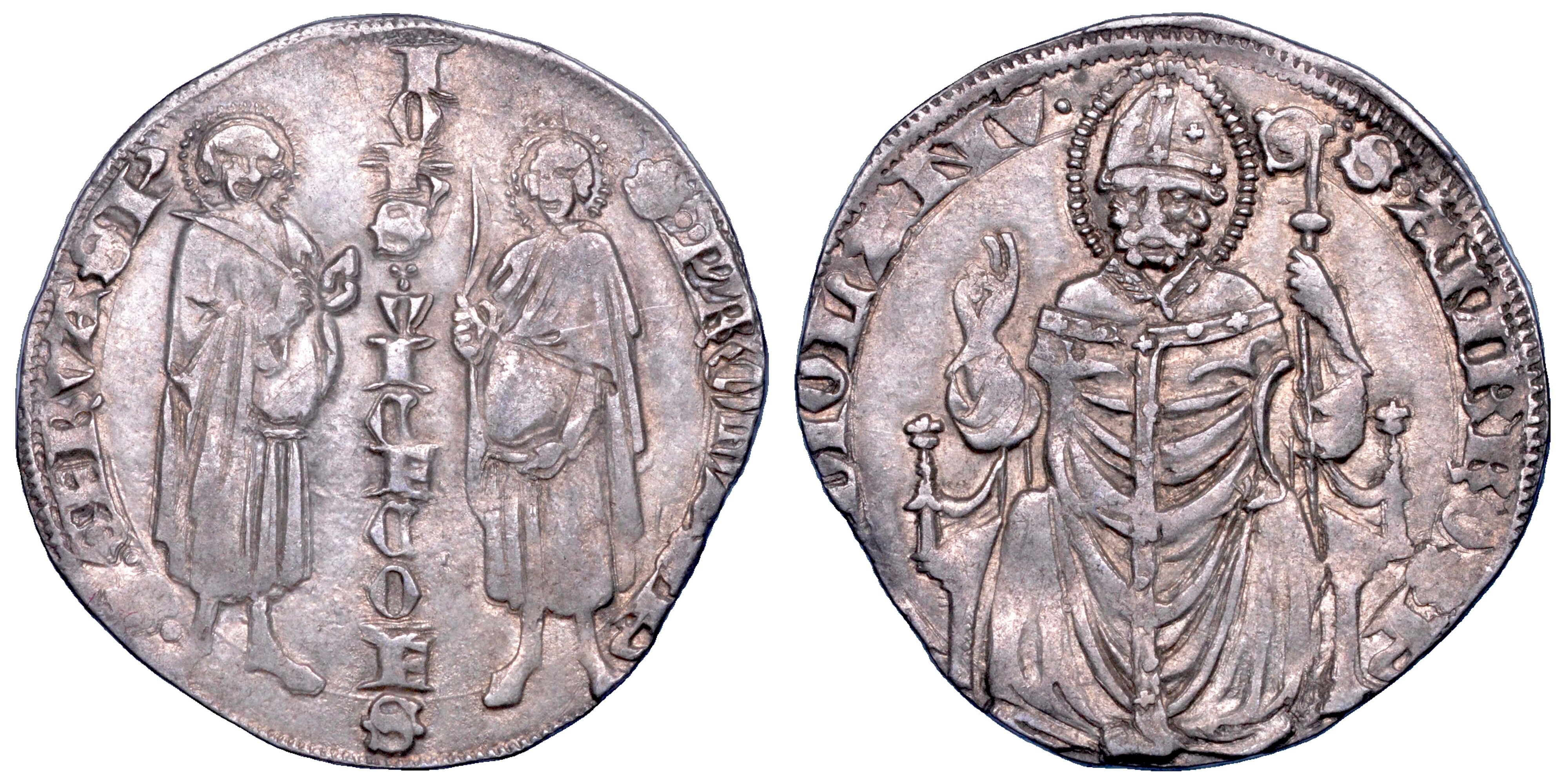 IOHS VICECOES scritto verticalmente. Nel giro: S GERVASI S PROTASI I santi Gervasio e Protasio nimbati, in piedi di prospetto con ramo di palma. R/ S AMBROSI MEDIOLANV Sant’Ambrogio, mitrato e nimbato, in cattedra, seduto di prospetto, benedicente e con pastorale nella mano s. Crippa 1. MEC 610-1. MIR 97/I. Rara. g. 2,72. Diam. mm. 23,31. Arg. MB/BB
