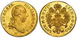 IOS II D G R I S A GE HV BO REX Testa a d. laureata; sotto, lettera M. R/ ARCH A D BVRG LOTH M D H 1787 Aquila bicipite sormontata da corona, caricata dello stemma austriaco coronato e circondato dal Collare del Toson d'Oro. Crippa 16/B. MIR 458/2. Raro g. 3,47. Diam. mm. 20,94 Oro. q.SPL