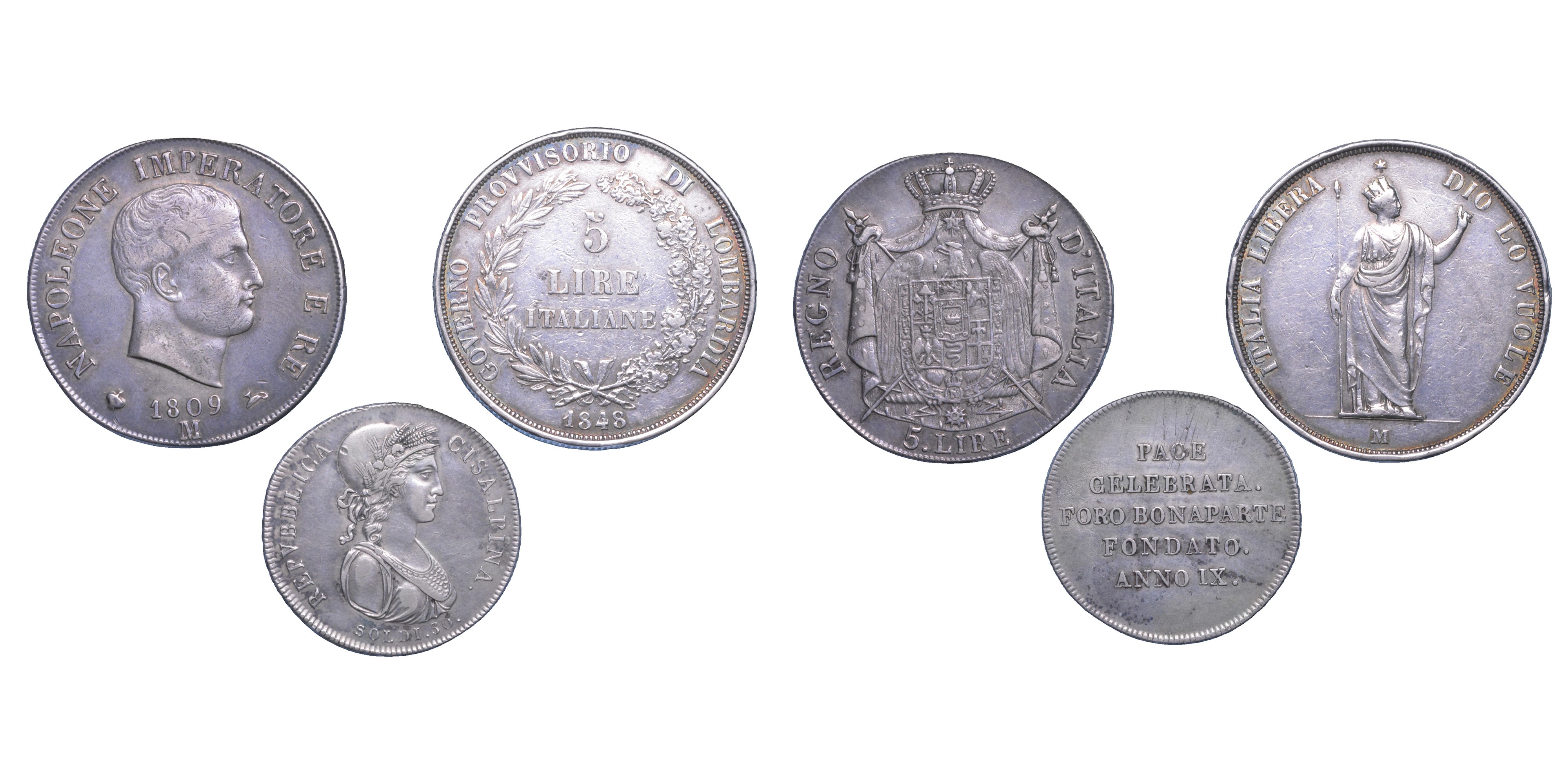 REPUBBLICA CISALPINA, 1800-1802. 30 Soldi A. IX. Gig 2. g. 7,32. Arg. BB/SPL - NAPOLEONE, 1805-1814. 5 Lire 1809. Gig. 100. g. 25,00. Arg. BB - GOVERNO PROVVISORIO DI LOMBARDIA, 1848. 5 Lire 1848. Gig. 3. g. 24,95. Arg. Colpi. q.BB