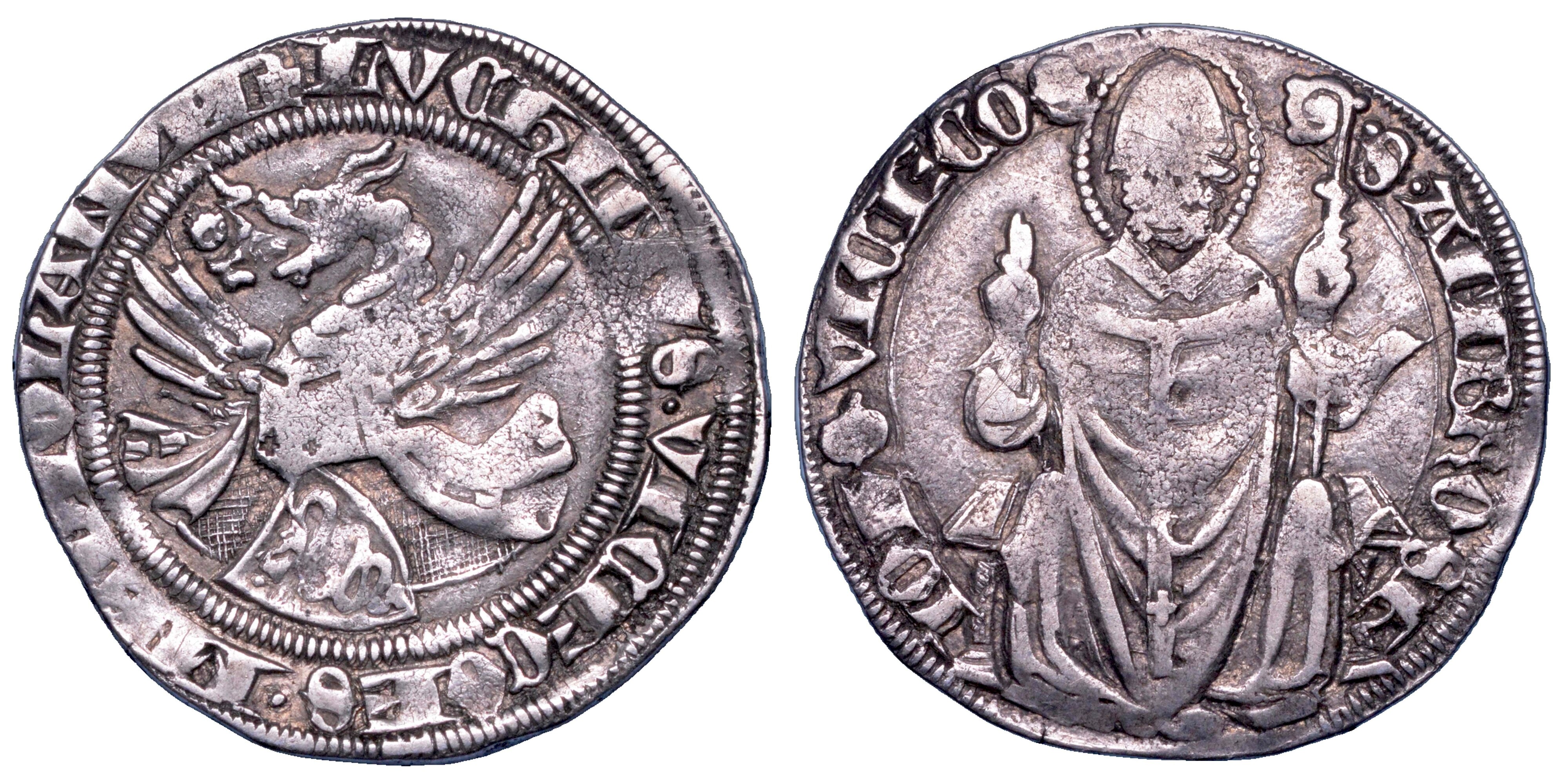 + LVCHINVS VICECOES MEDIOLANVM Scudetto con la biscia sormontato da elmo e cimiero ornato da drago alato, con fanciullo nelle fauci. R/ IOHS VICECOES S AMBROSI (scritto dal basso a s.). Sant’Ambrogio, mitrato e nimbato, seduto in cattedra di prospetto, benedicente e con pastorale nella mano sinistra. Crippa, 2. CNI 3-3a. MEC 609. MIR 95/1. Rara. g. 2,69. Diam. mm. 23,47. Arg. MB/q.BB