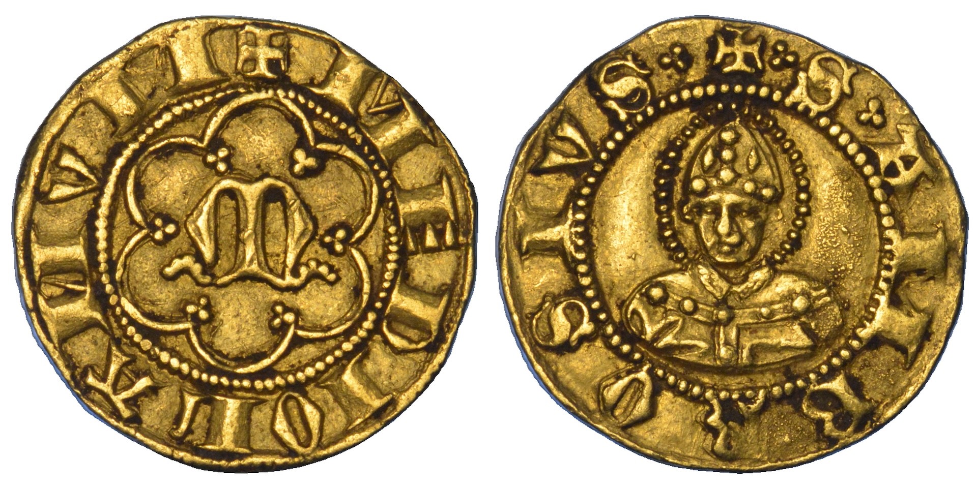 + MEDIOLANVM Grande M gotica in cornice di archi ornata da trifogli. R/ + (trifoglio) S (trifoglio) AMBROSIVS (trifoglio) Busto di prospetto di S. Ambrogio con testa mitrata e nimbata. Crippa 1/A. g. 1,75. Diam. mm. 15,74. Oro. buon BB