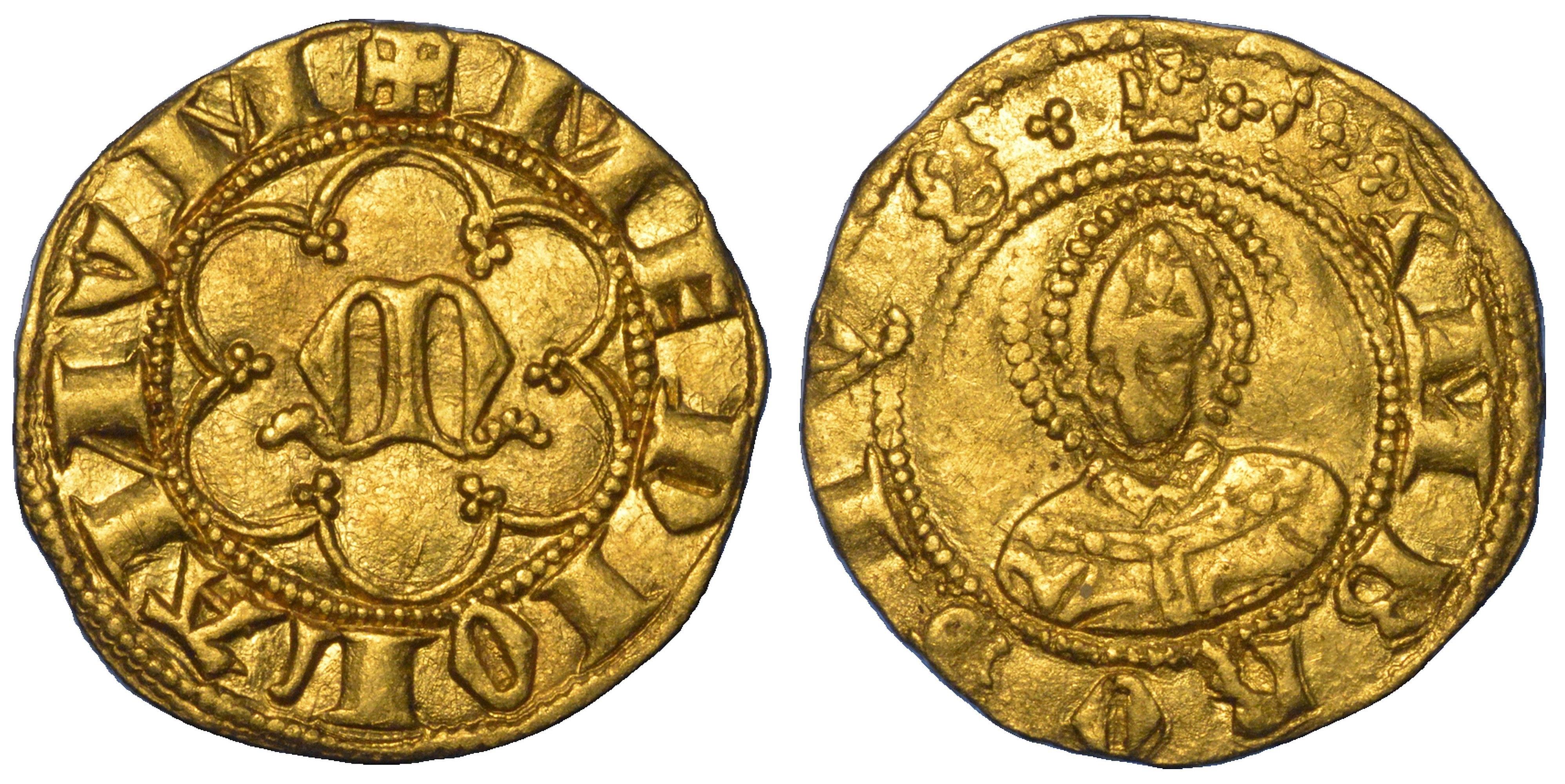 + MEDIOLANVM Grande M gotica in cornice di archi ornata da trifogli. R/ + (trifoglio) S (trifoglio) AMBROSIVS (trifoglio) Busto di prospetto di S. Ambrogio. Crippa 1/A. g. 1,72. Diam. mm. 15,54. Oro. Sdoppiamento di conio al rovescio. q.SPL