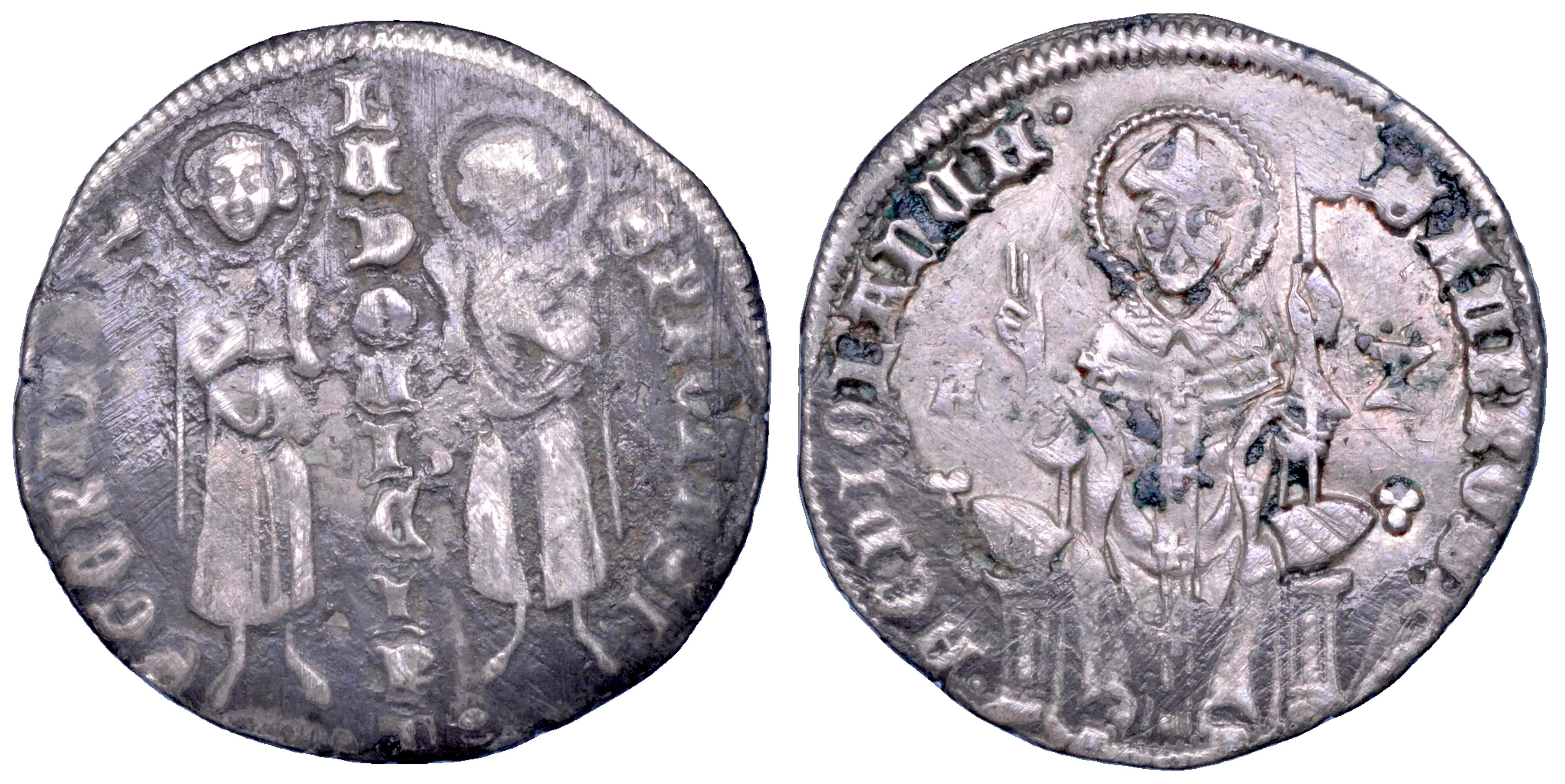 LVDOVIC IPT scritto al centro verticalmente. Nel giro, S PROTASI' a d. e S GERVASI' a s. I Santi Gervasio e Protasio nimbati, in piedi di prospetto, stringono una croce. R/ S AMBROSI' MEDIOLANVM S. Ambrogio mitrato e nimbato, seduto di fronte, benedice con la mano d. e regge il pastorale con la s. Ai lati, A Z. Crippa 1 (R/3). CNI 1/7. MEC 593. MIR 82/1. Rarissimo. g. 1,99. Diam. mm. 20,27. Arg. MB