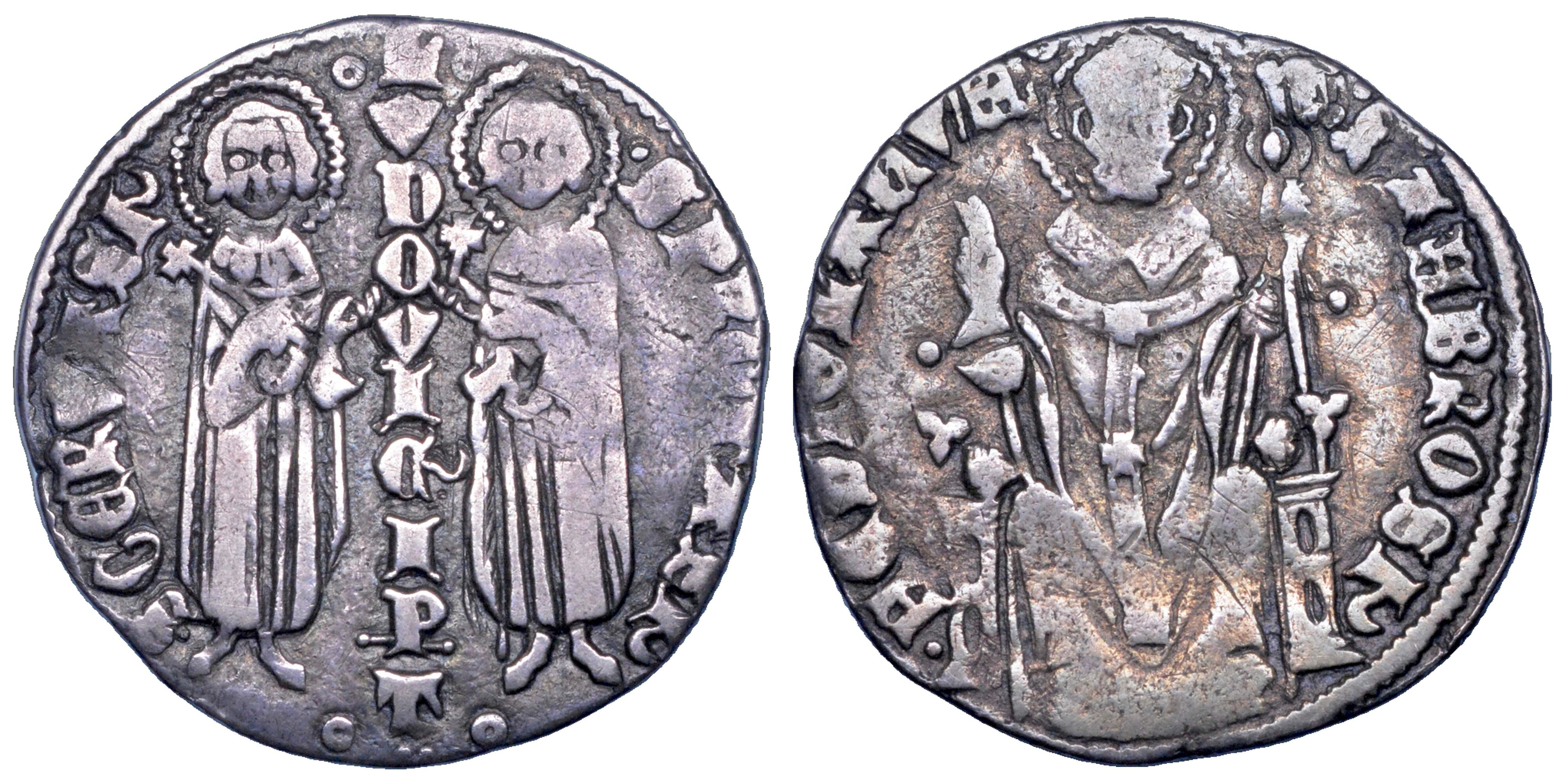 LVDOVIC IPT scritto al centro verticalmente. Nel giro, S PROTASI' a d. e S GERVASI' a s. I Santi Gervasio e Protasio nimbati, in piedi di prospetto, stringono una croce. In bssso, due cerchietti. R/ S AMBROSI' MEDIOLANVM S. Ambrogio mitrato e nimbato, seduto di fronte, benedice con la mano d. e regge il pastorale con la s. I guanti di Sant.Ambrogio sono ornati da due globetti. Crippa 4/B (R/3). CNI 6/9. MEC, 593. MIR 82/1. Rarissimo. g. 1,85. Diam. mm. 20,38. Arg. q.BB/MB