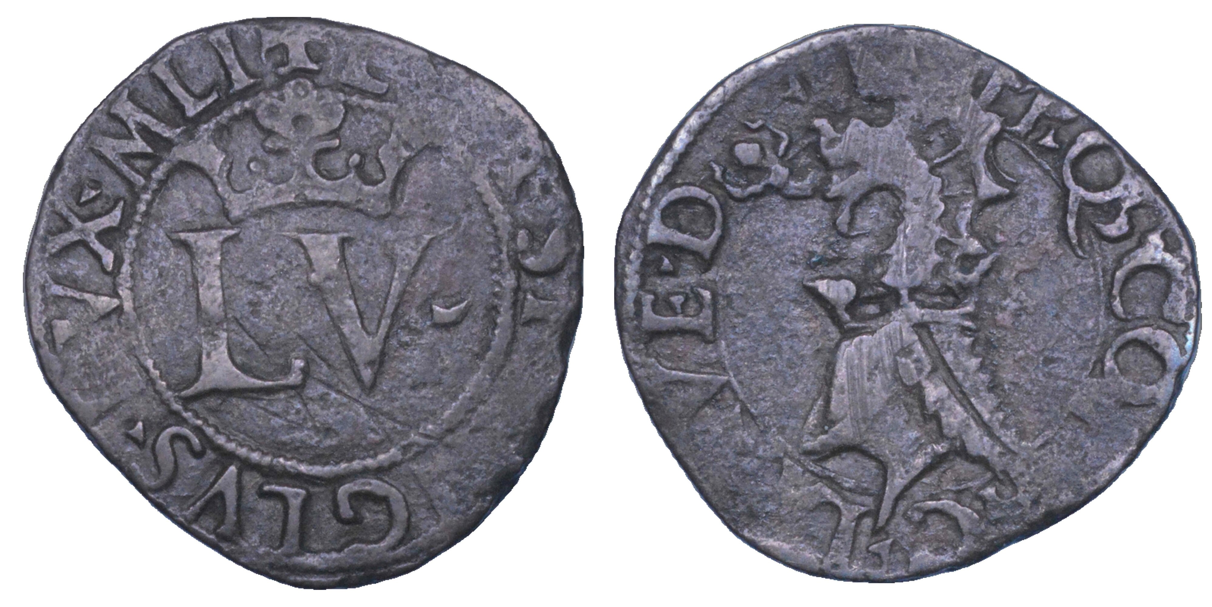 + LV M SF ANGLVS DVX MLI Le iniziali LV sormontate da corona ducale. R/ PP Q3 CO AC IANVE D Elmo coronato e con cimiero ornato da drago crestato. Crippa, 3. MIR 230/1. g. 0,86. Diam. mm. 15,87. Rarissimo. Mist. MB
