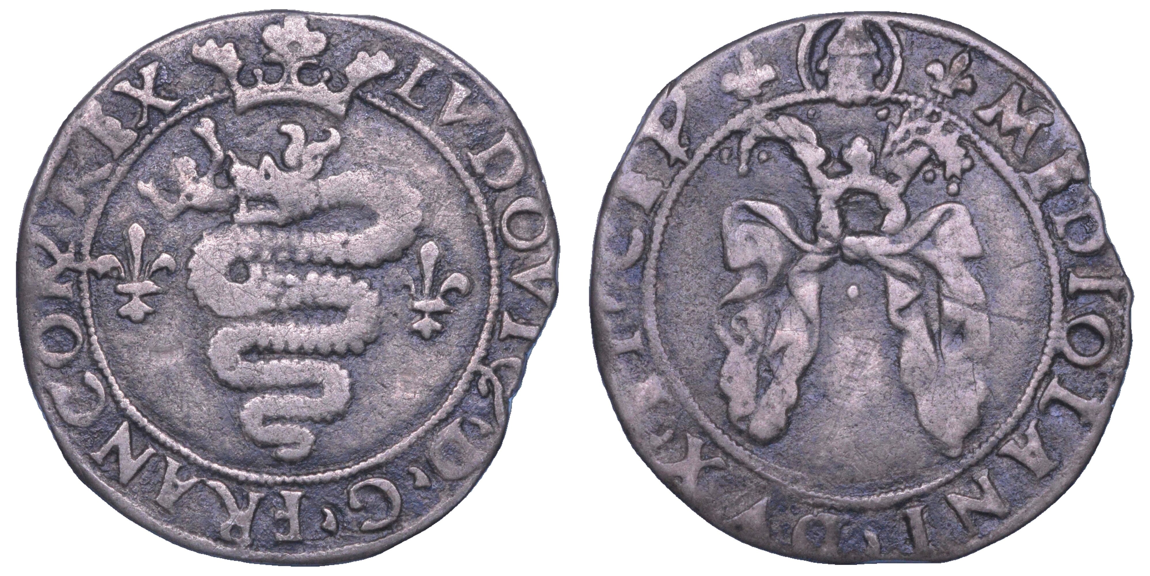 LVDOVIC D G FRANCOR REX Biscia viscontea coronata; ai lati, due gigli. R/ (testina di S. Ambrogio) (giglio) MEDIOLANI DVX ET CET (giglio) L’impresa del velo annodato con corona da cui escono rami di palma e di olivo. Crippa, 11. g. 2,04. Diam. mm. 21,97. Raro. Arg. MB