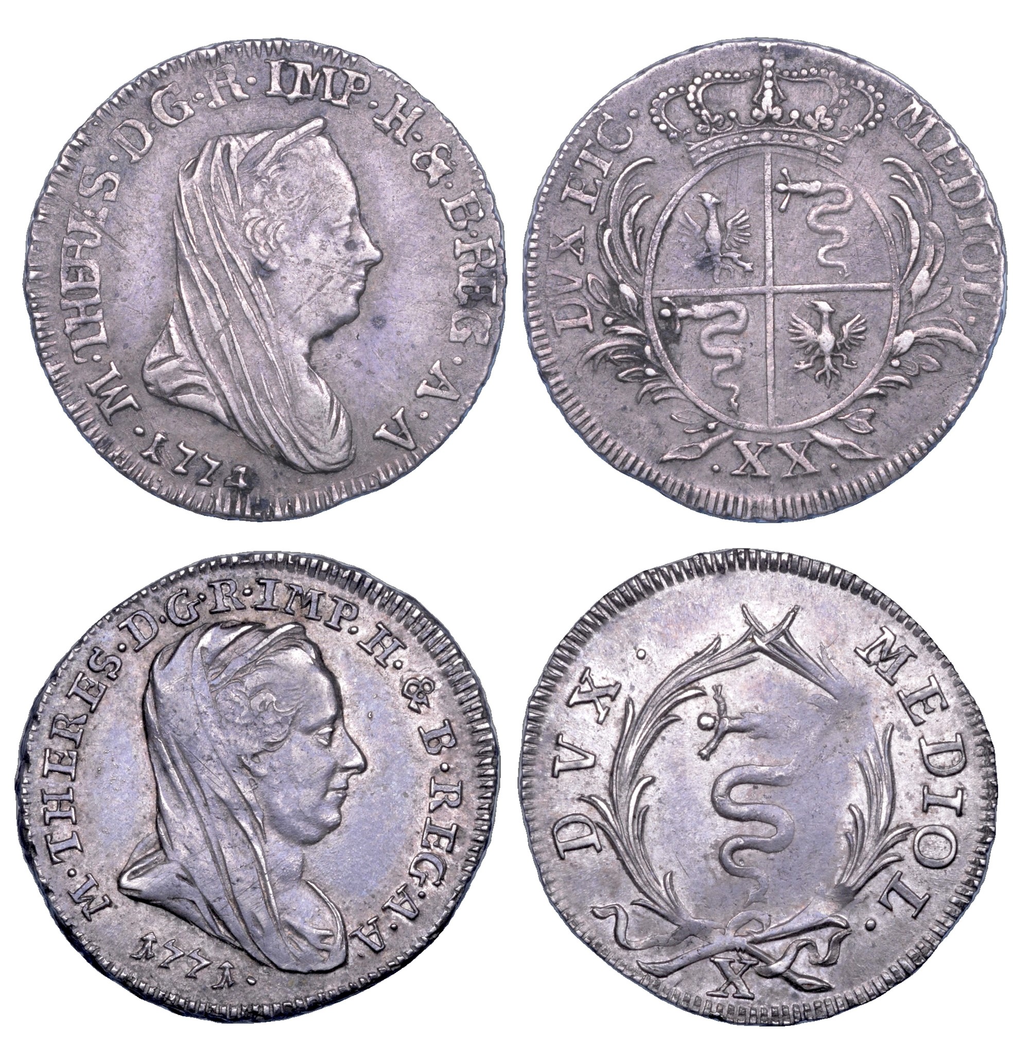 Da 20 Soldi 1774. M THERES D G R IMP H & B REG A A Busto velato a d. R/ MEDIOL DVX ETC Scudo ovale inquartato sormontato da corona; ai lati, rami di ulivo e di palma. Crippa 8/B. MIR 425/3. Rarissimo. g. 3,65. diam. mm. 22,66. Arg. Lievi graffi. q.BB - Da 10 Soldi 1771. M THERES D G R IMP H & B REG A A Busto velato a d. R/ MEDIOL DVX Biscia viscontea entro rami annodati; in esergo, X. Crippa 10/A. MIR 427/1. Molto raro. g. 1,80. Diam. mm. 19,91. Arg. Debolezza di conio al rovescio. Migliore di BB