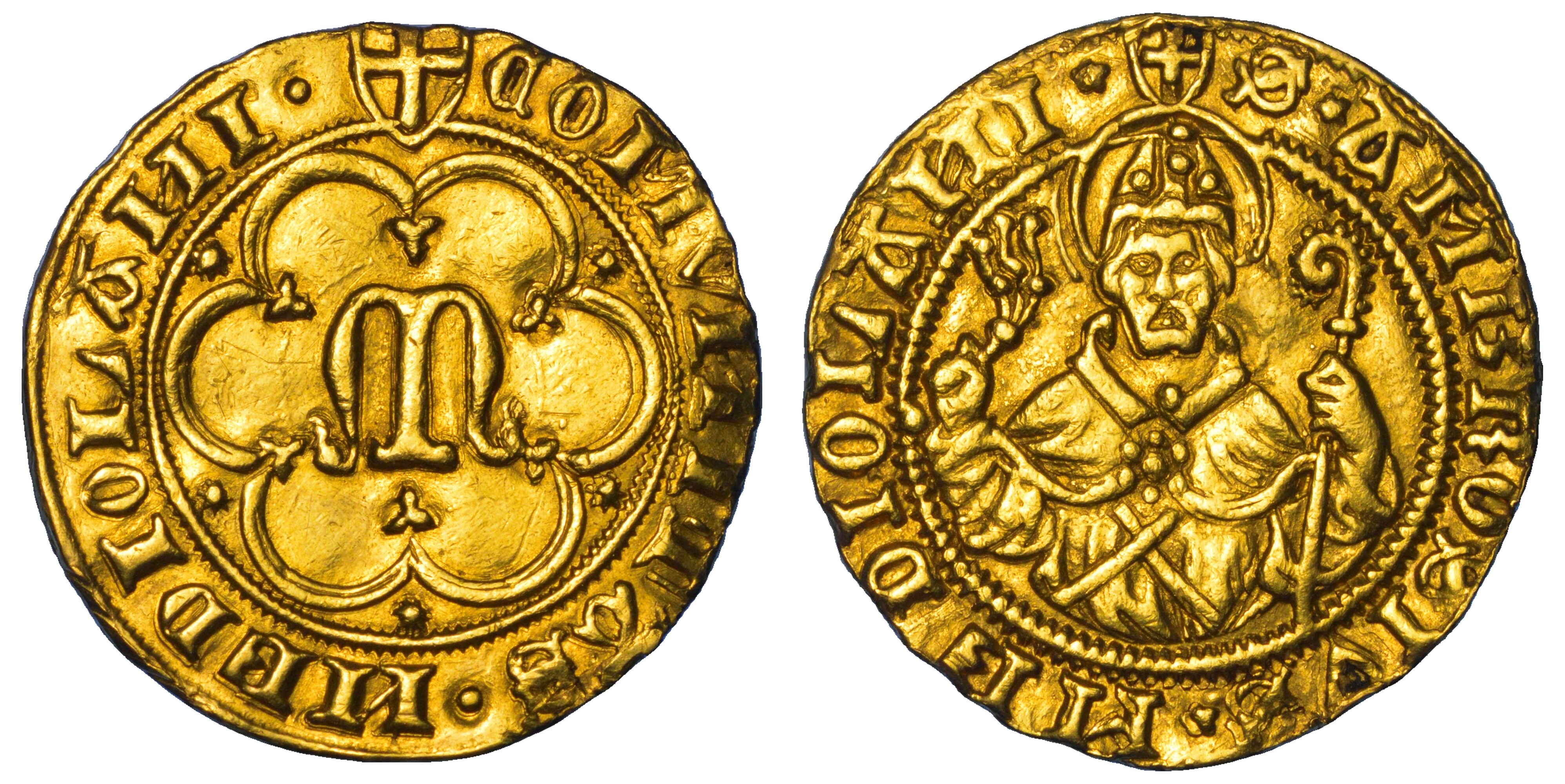 (scudetto) COMVNITAS MEDIOLANI Nel campo lettera M, in carattere gotico, entro cornice formata da sei doppi archi, ornati all’interno da sei trifogli e all’esterno da cinque stellette. R/ (scudetto) S AMBROSIVS MEDIOLANI Sant’Ambrogio, a mezza figura di prospetto, mitrato e nimbato, tiene staffile e pastorale; in petto, rosetta a sei petali. Crippa, 1/A. CNI 1. MEC 1, -. MIR 166/1 (questo esemplare pubblicato). Estremamente rara. g. 3,40. Diam. mm. 21,68. Oro. Impercettibili tracce di montatura. BB