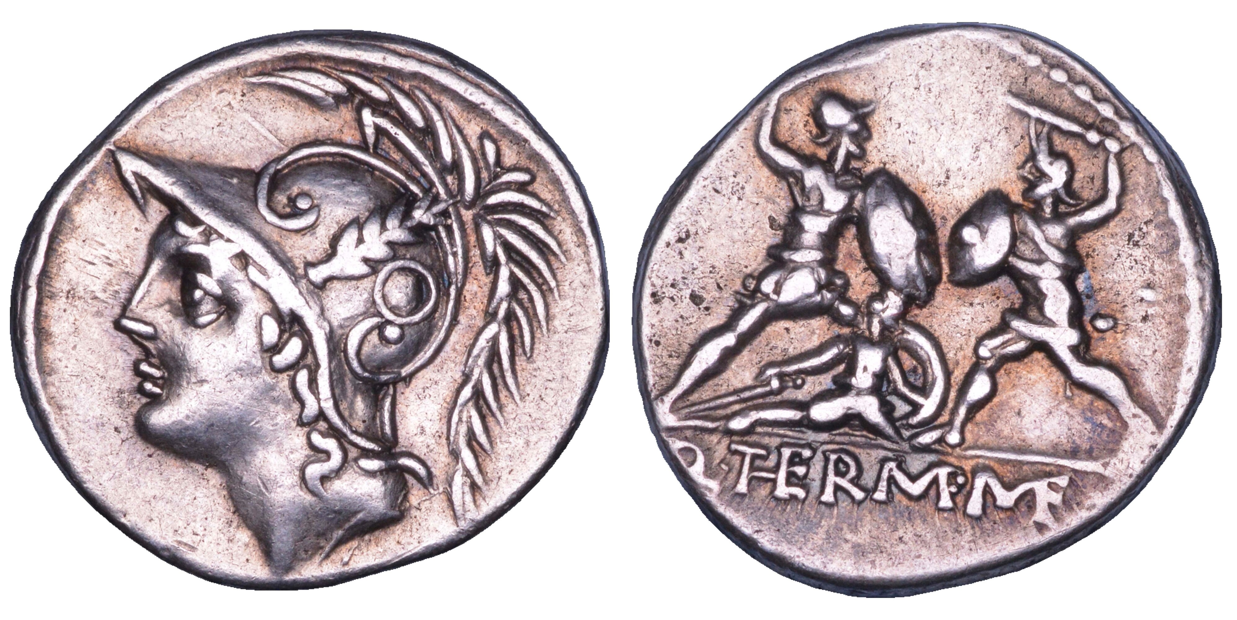 Testa elmata di Marte a s. R/ Il guerriero a s. protegge un compagno caduto dall’attacco di un guerriero barbaro a d. Crawford 319/1. Sydenham 592. Minucia 19. g. 3,90. Diam. mm. 17,50. Arg. Buon BB