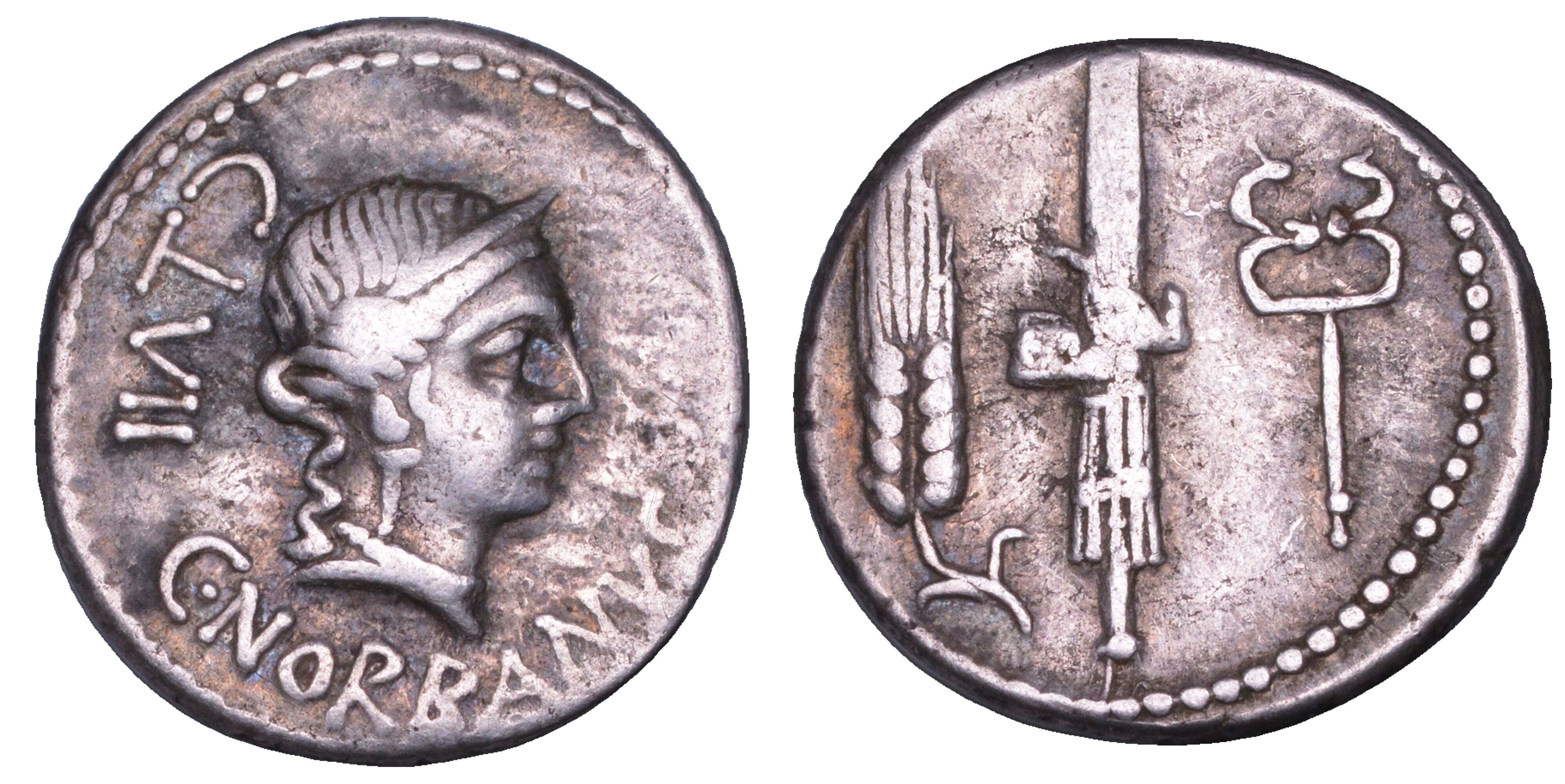 Testa di Venere diademata a d., con orecchino pendente e collana di perle; dietro, CLVII; sotto C NORBANVS. R/ Spiga di grano, fasci littori legati con ascia e caduceo. Bab. 2. Cr. 357/1b. Syd. 739. g. 4,01. Diam. mm. 18,09. Arg. MB/BB