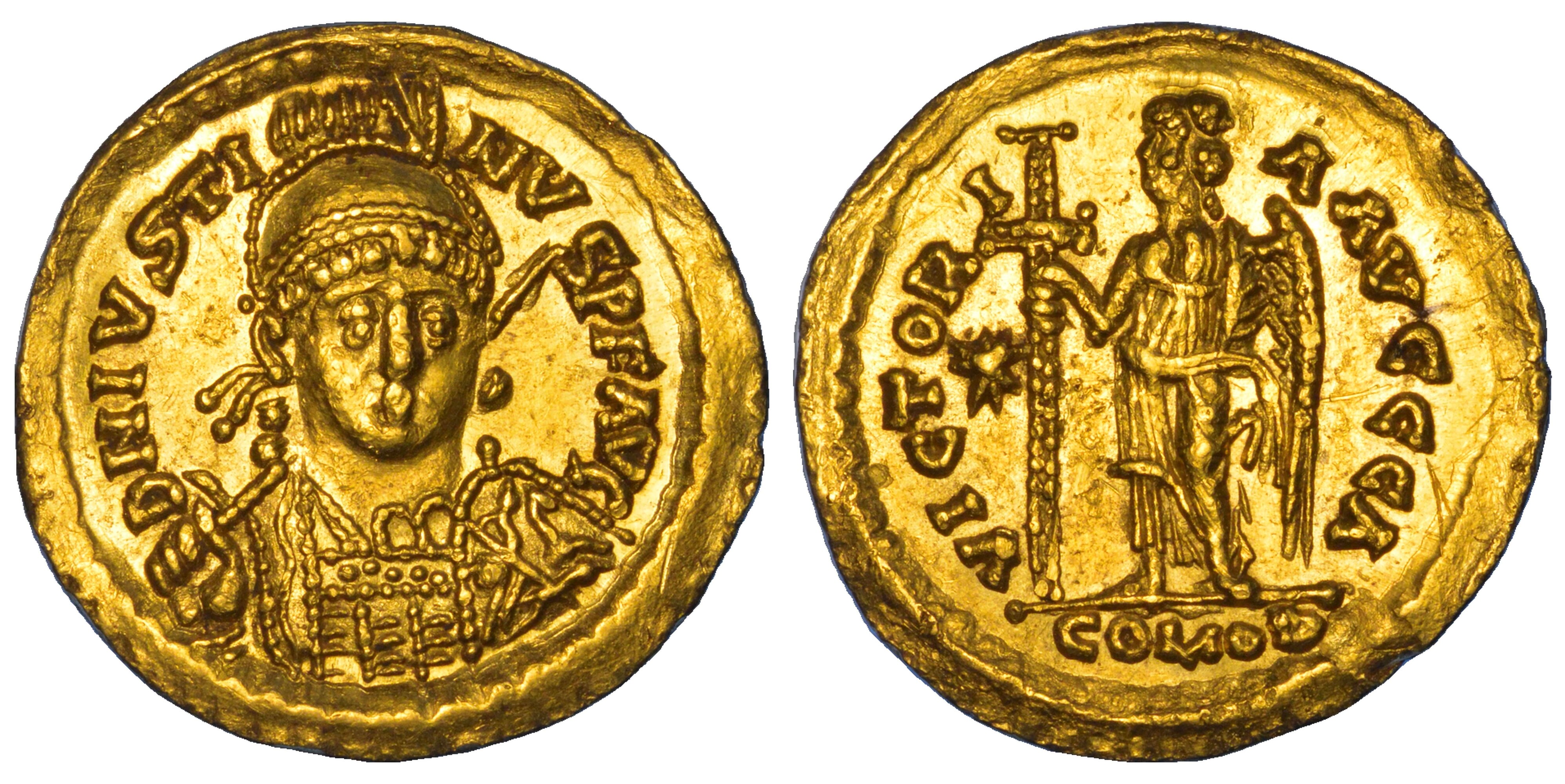DNIVSTI NVS PF AVG Busto elmato di fronte, diademato e corazzato, lancia nella mano d. tenuta sopra la spalla d. e scudo decorato sul braccio s. R/ VICTORI AAVCCCA Vittoria in piedi a s., con lunga croce; in campo a s., stella, nell'esergo, COMOB. MiB 24 (Roma). BMC Vandali p.48, 12 (Ravenna). Cfr. Arslan 50. g. 4,43. Diam. mm. 21,03. Oro SPL