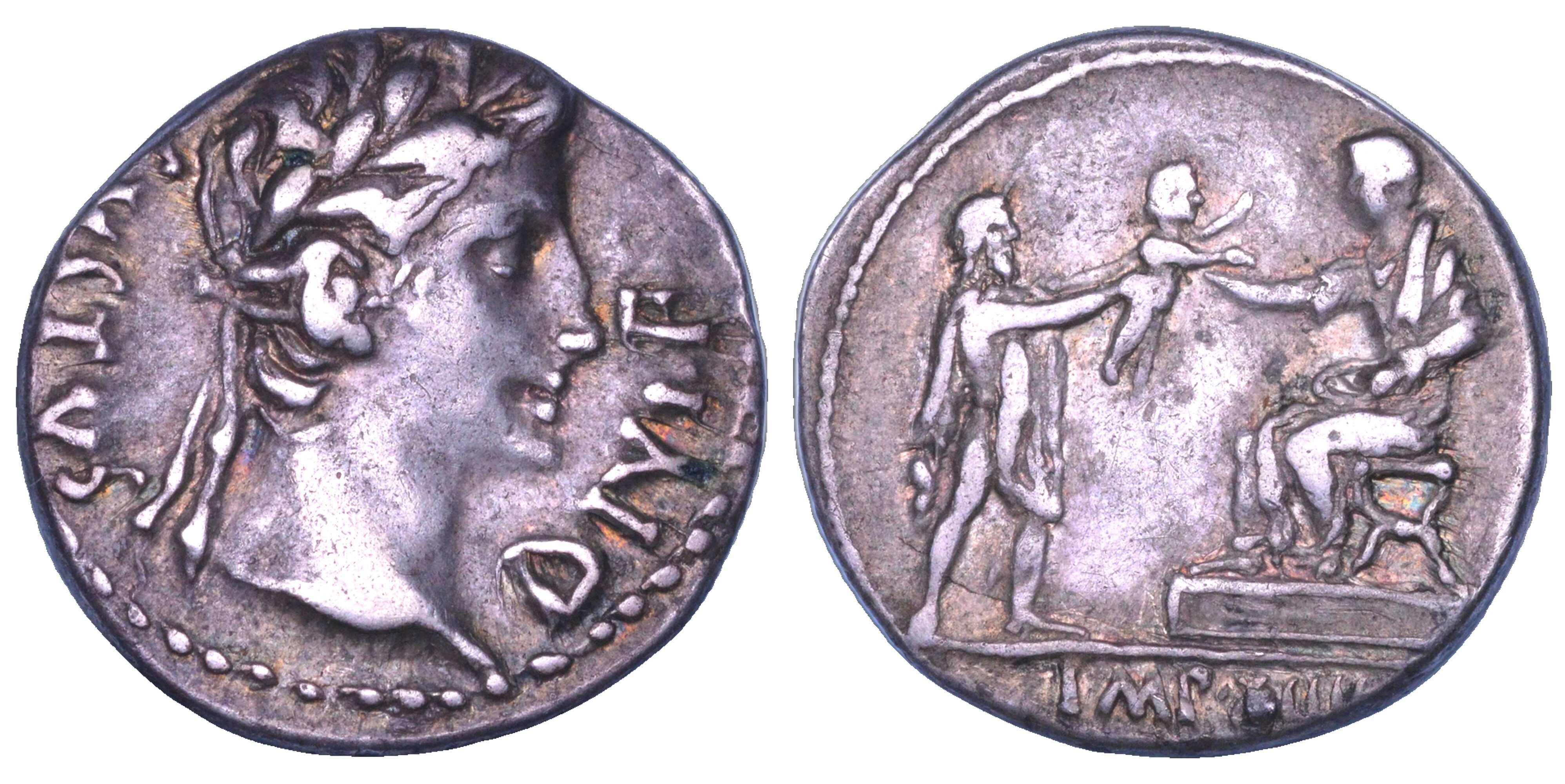 AVGVSTVS – DIVI F Testa laureata a d. R/ Augusto, togato e seduto su sella curule, alza braccio verso bambino sollevato da figura maschile ammantata. C. 175. BMC 494. RIC 201a. Raro. g. 3,78. Diam. mm. 18,61. Arg. BB