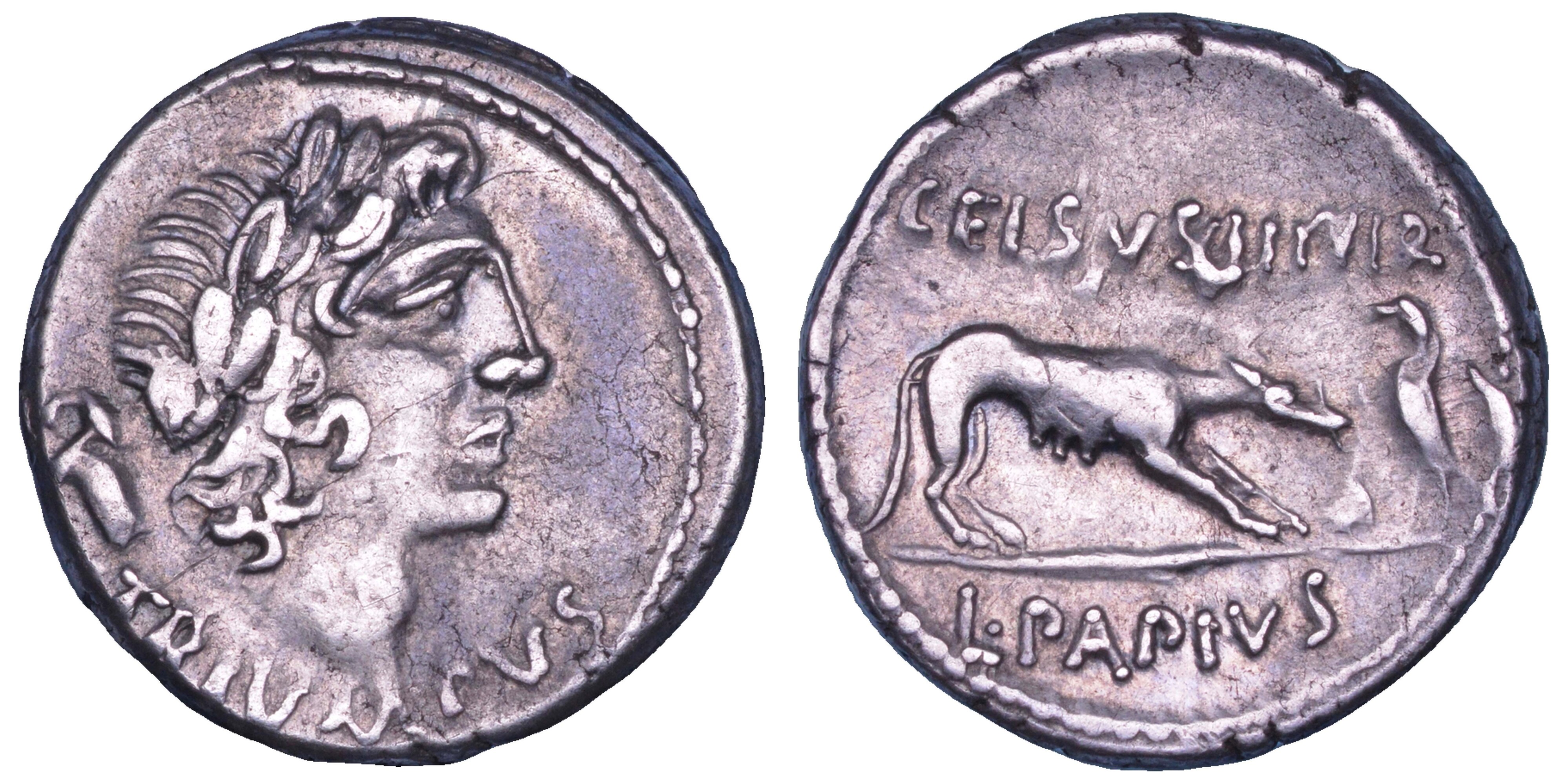 PAPIA. L. Papius Celsus, 45 a.C. Denario.