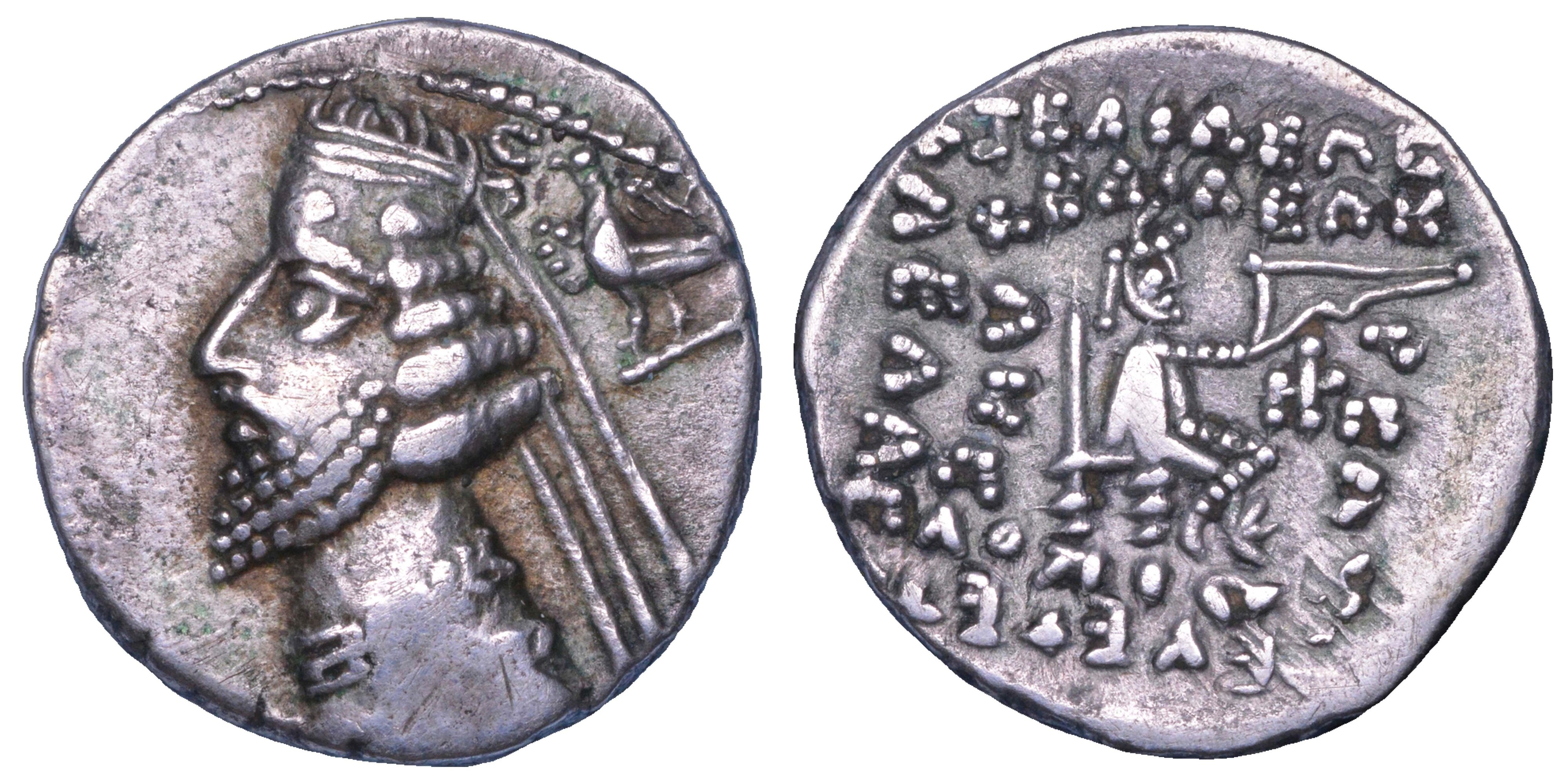 Busto di Phraates a s., dietro a d. aquila. R/ Arciere seduto su un trono a d., con un arco nella mano d.. Ecbatana, 38-2 a.C. Sellwood 52.10. g. 3,85. Diam. mm. 17,88. q.BB