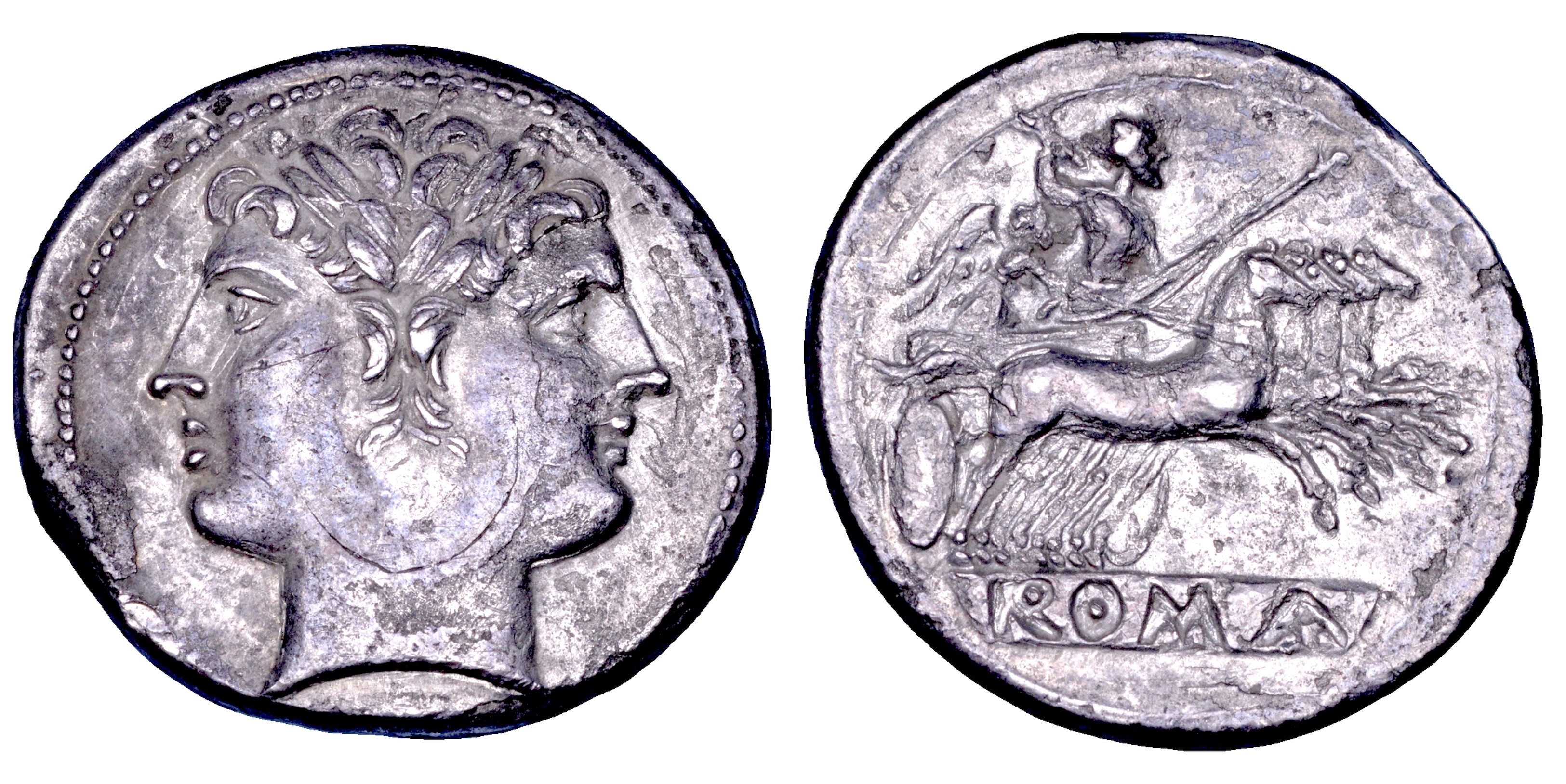 Testa laureata gianiforme dei Dioscuri. R/ Giove regge uno scettro e scaglia un fulmine, assisito da Vittoria che guida quadriga al galoppo sotto; ROMA incusa in tavoletta in rilievo. Syd. 64. Cr. 29/3. g. 6,03. Diam. mm. 21,38. Arg. Graffi. Migliore di BB